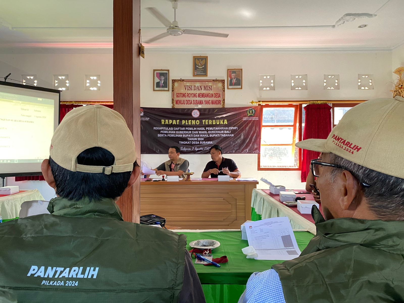 Dalam rentang waktu mulai 1 Agustus hingga 3 Agustus 2024 penyelenggara di tingkat desa yakni Panitia Pemungutan Suara ( PPS ) telah lakukan Pleno Rekapitulasi Daftar Pemilih Hasil Pemutakhiran ( DPHP ) Pemilihan Gubernur dan Wakil Gubernur serta Bupati dan Wakil Bupati Tabanan Tahun 2024, yang bertempat di kantor desa masing masing. Rekapitulasi ini merupakan tindak lanjut dari hasil kerja Coklit ( pencocokan dan penelitian ) yang telah dilaksanakan oleh Petugas Pemutakhiran Data Pemilih ( Pantarlih ) selama 30 hari ( 24 Juni – 24 Juli 2024 ).