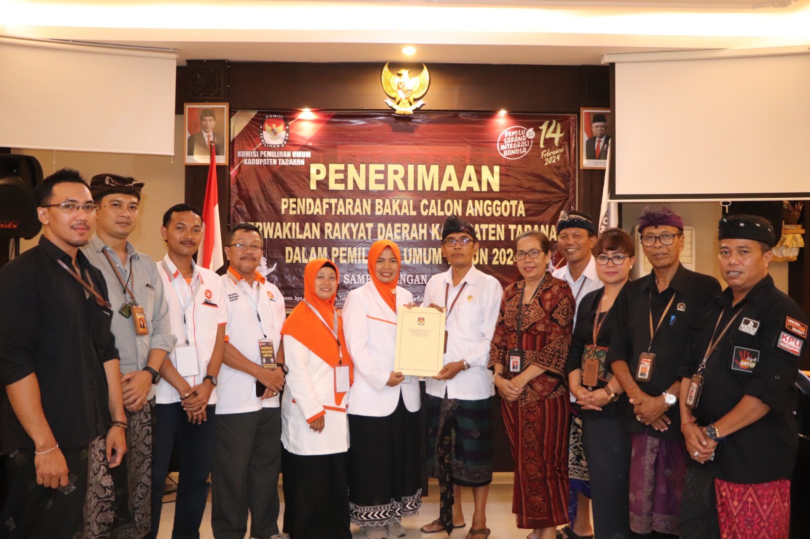 Dan untuk pendaftaran yang terakhir datang dari Partai Keadilan Sejahtera (PKS) yang mengajukan kembali Bakal Calon Anggota DPRD Kab. Tabanan di KPU Tabanan setelah sebelumnya mendapat status DIKEMBALIKAN. PKS tiba di KPU Tabanan, Kamis ( 11/5 ) pukul : 15.29 Wita, Hadir Ketua DPD PKS Tabanan, Kanti Rahayu didampingi Sekretaris, Bacaleg, LO dan Admin Silonnya. Setelah dilakukan pengecekan berkas melalui aplikasi Sistem Informasi Pencalonan ( SILON ) oleh Admin dan Operator Silon KPU Tabanan, akhirnya PKS diberikan status DITERIMA karena berkas pengajuannya telah lengkap dan diterima.”