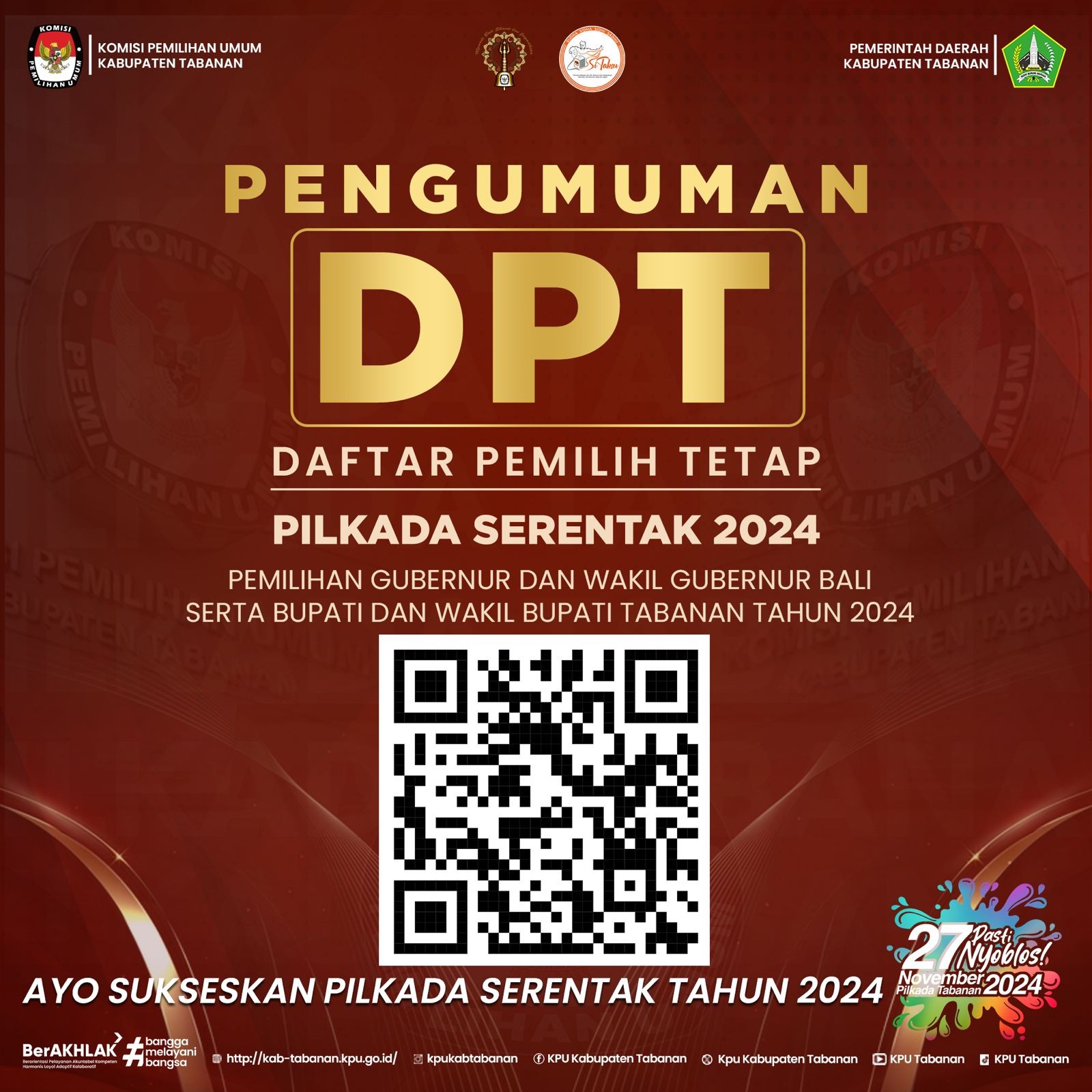 KPU Tabanan Hari ini minggu 22 September Komisi Pemilihan Umum Kabupaten Tabanan mengumumkan Daftar Pemilih Tetap yang telah ditetapkan pada tanggal 20 September 2024. KPU Tabanan menginformasikan selengkapnya pada tautan atau link dan barcode berikut