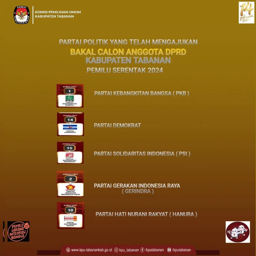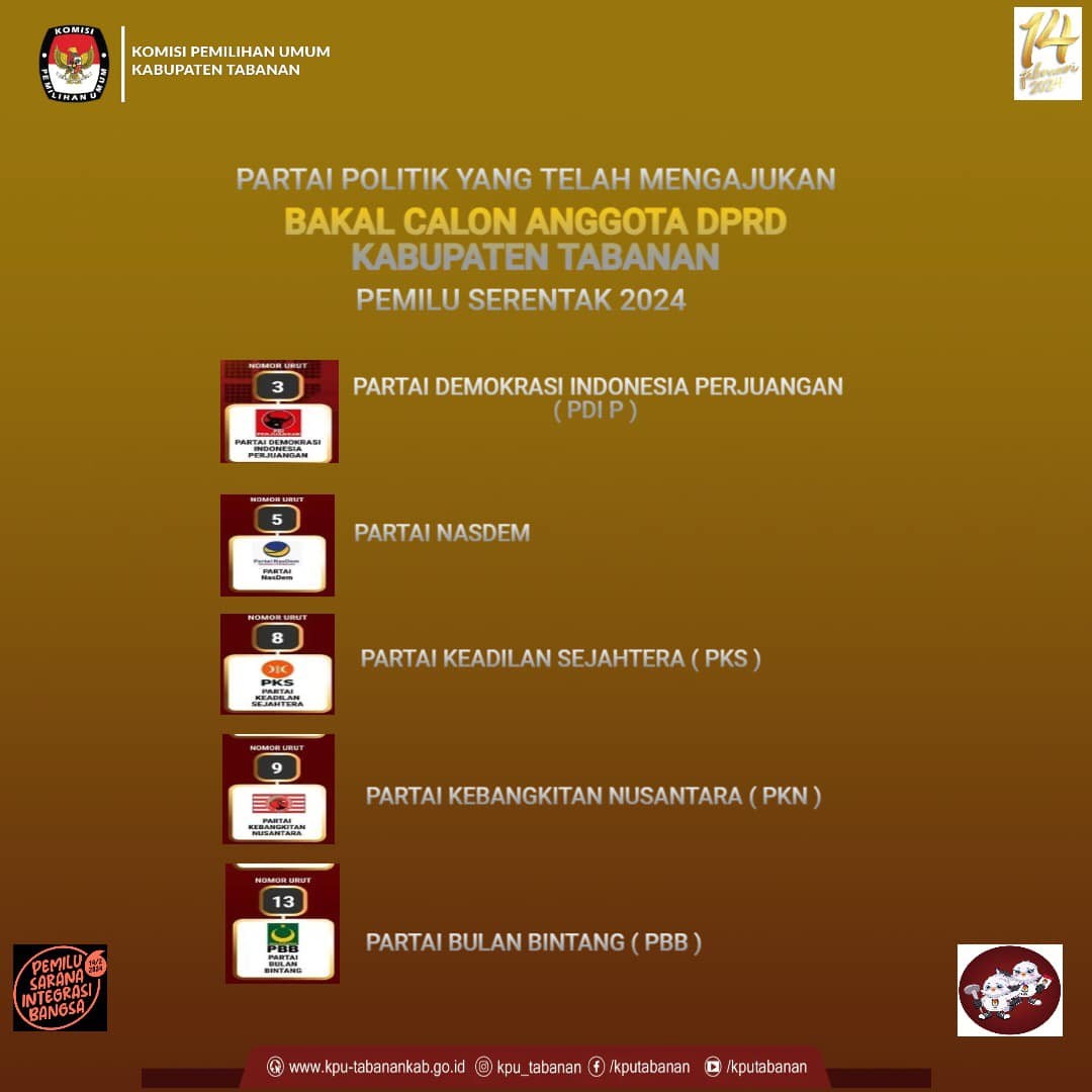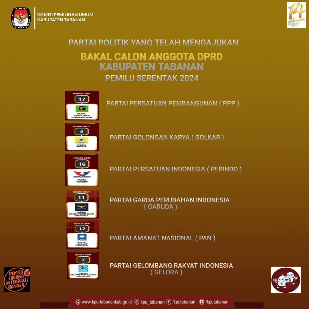 Sebagai informasi, KPU Tabanan secara keseluruhan menerima pendaftaran Bacaleg dari sebanyak 17 Parpol yang ada di Kabupaten Tabanan yaitu terakhir dari Partai Ummat. tetapi karena tidak lengkap dan batas waktu pendaftaran juga telah lewat akhirnya dokumen pendaftaran Partai Ummat dikembalikan.(Humas KPU Tabanan).