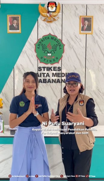 KPUTABANAN. Teman Pemilih Komisi Pemilihan Umum Kabupaten Tabanan hadiri Pemilihan Presiden Mahasiswa dan Wakil Presiden Mahasiswa di Sekolah Tinggi Kesehatan Advaita Medika Tabanan, pada Jumat 26 September 2025. KPU Tabanan lakukan pendampingan pada proses dan tahapan Pemilihan Presma dan Wapresma di kampus tersebut. Hadir Kepala Divisi Sosialisasi, Pendidikan Pemilih, Partisipasi Masyarakat dan SDM KPU Tabanan, Ni Putu Suaryani bersama tim Humas.