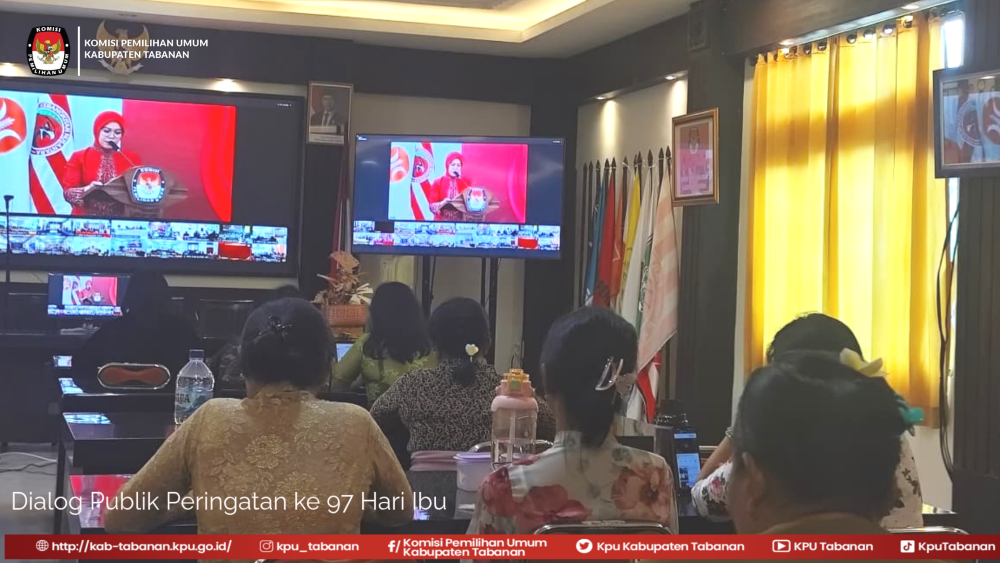 KPUTABANAN. Dialog Publik dalam peringatan ke 97 hari Ibu, 22 Desember 2025 bertemakan “ Perempuan Penggerak Perubahan, Perempuan Memimpin, Demokrasi Berkembang”. Merupakan tema menarik yang disampaikan oleh beberapa narasumber dalam dialog publik yang diikuti oleh KPU Kabupaten Tabanan secara daring ( zoom meeting ) di ruang rapat kantor KPU Tabanan pada Senin 22 Desember 2025.