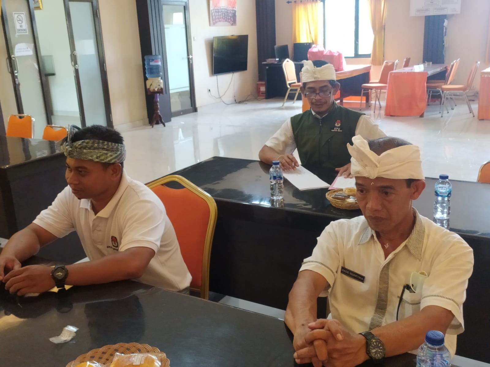Anggota Pokja yang berasal dari Dinas Pemberdayaan Masyarakat dan Pemerintahan Desa (DPMD) Kabupaten Tabanan, I Putu Yudasuara dan I Nyoman Arta Susila (Badan Kesbangpol Kabupaten Tabanan) serta I Wayan Januada (Disdukcapil Kabupaten Tabanan) menyampaikan perasaan syukurnya kehadirat Tuhan Yang Maha Esa karena tugas-tugas telah berjalan dengan lancar. (Humas KPU Tabanan).