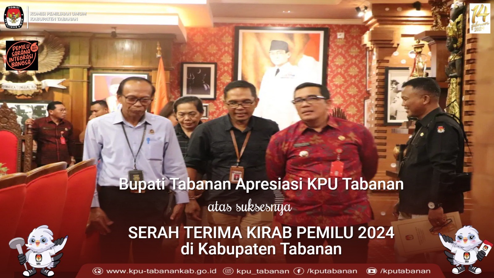 Bupati Tabanan, I Komang Gede Sanjaya mengungkapkan apresiasinya kepada KPU Tabanan sekaligus berterimakasih telah membawa harum nama Tabanan. Bupati Tabanan berharap KPU Tabanan dapat terus menjalin koordinasi dengan Pihak Pemda Tabanan dalam setiap Tahapan Kepemiluan, baik itu Pemilihan Umum terlebih lagi Pemilihan Kepala Daerah.