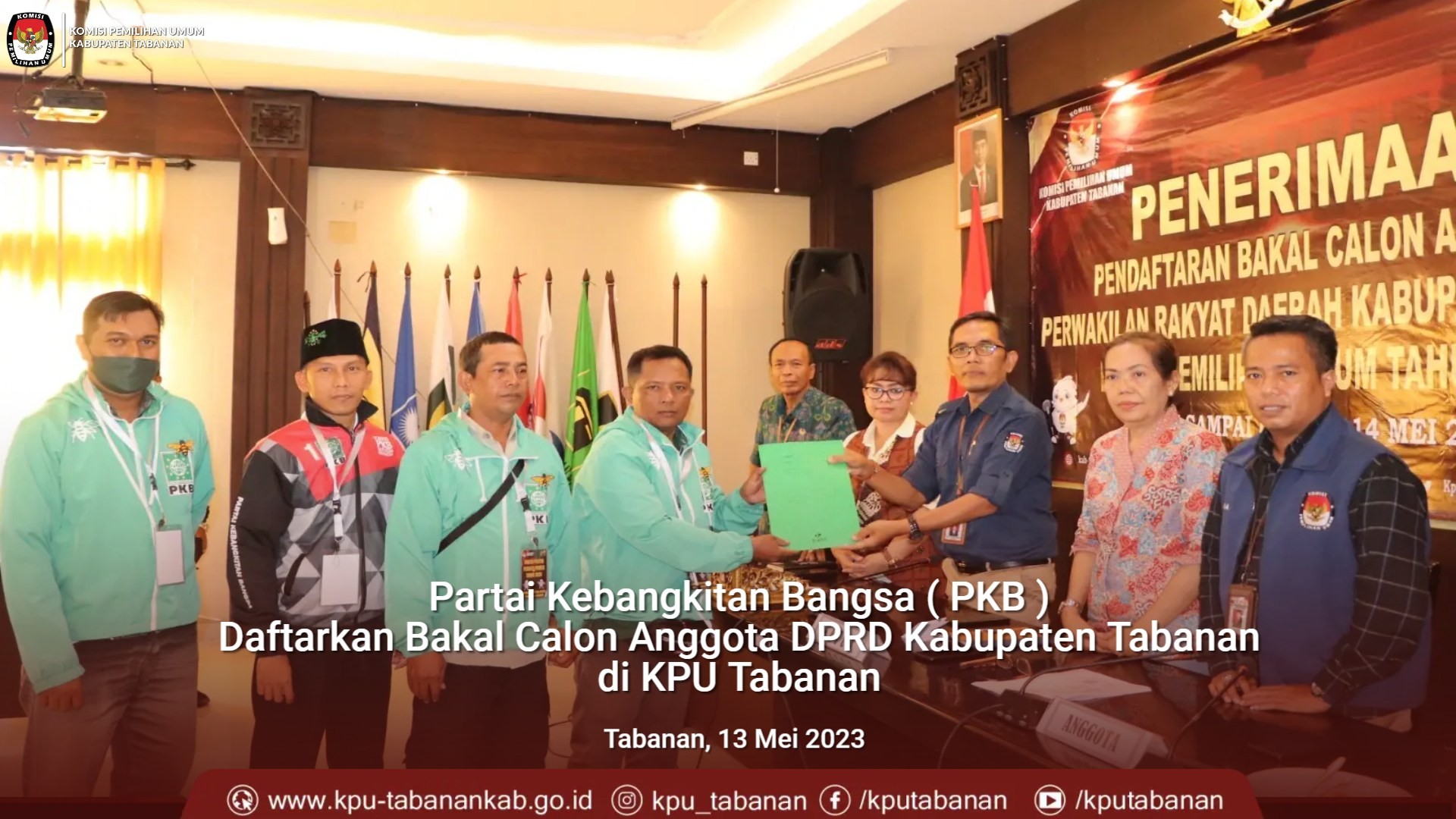 Untuk Partai Kebangkitan Bangsa ( PKB ) ajukan Bakal Calon Anggota DPRD Kabupaten Tabanan di KPU Tabanan. PKB diterima oleh KPU Tabanan, Sabtu ( 13/5 ) Pukul : 14.53 wita. Dalam pengajuan tersebut hadir Sekretaris DPC PKB Tabanan, Dodik Irawan dan jajaran, Bacaleg, LO dan Admin Silon. KPU Tabanan melakukan pengecekan berkas melalui aplikasi Silon oleh Admin dan operatos Silon KPU Tabanan, kemudian KPU Tabanan memberikan status DITERIMA karena berkas pengajuan telah lengkap dan diterima.