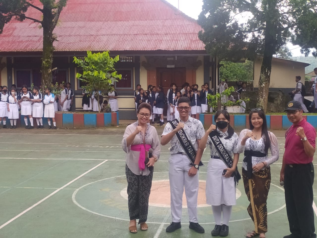Untuk di SMAN 1 Pupuan kebetulan saat itu Duta Demokrasi sedang mensosialisasikan terkait Pemilu Serentak 2024 di lingkungan Sekolah (mimbar Pemilu). (Humas KPU Tabanan).