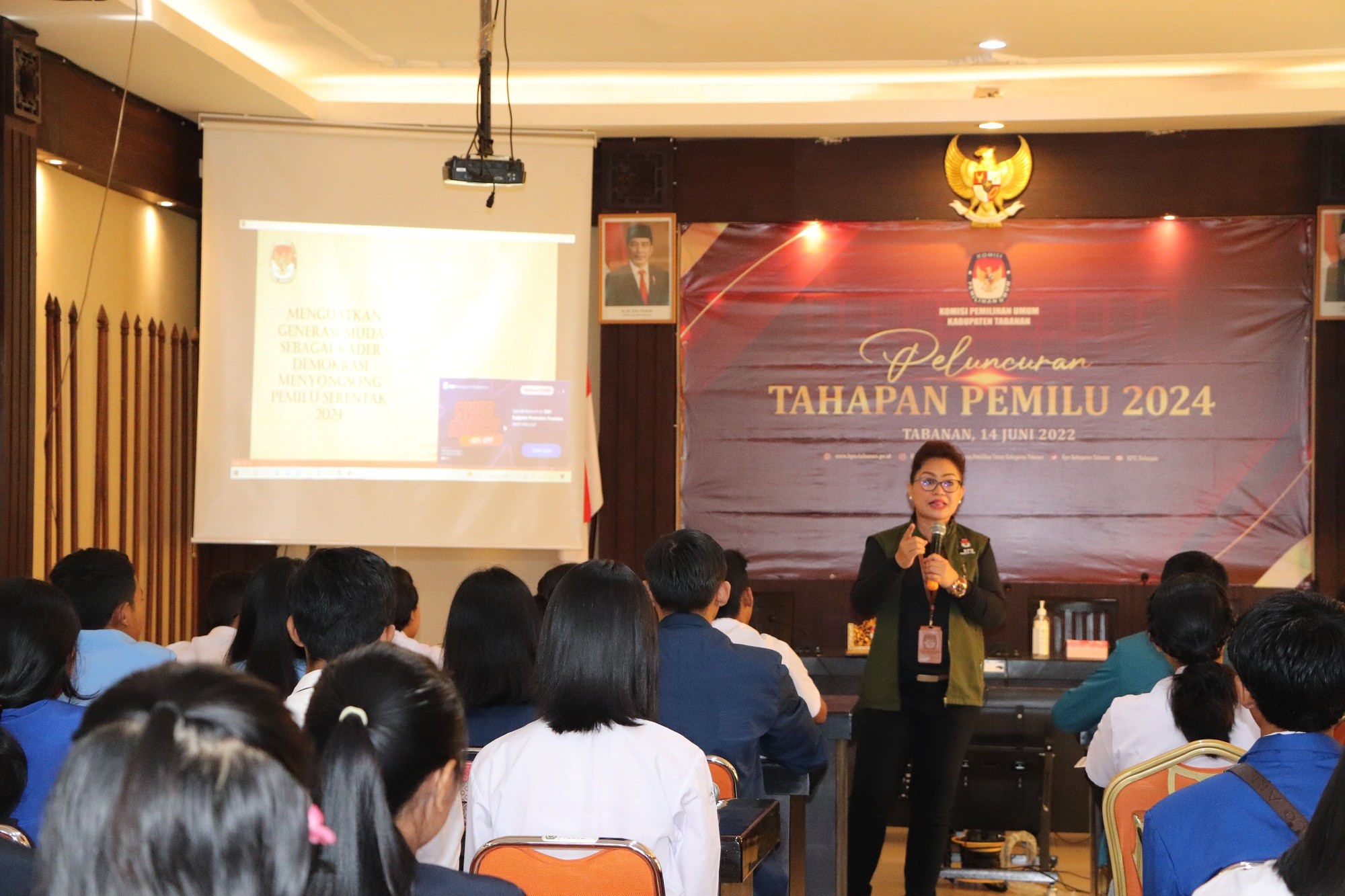 Peserta yang hadir yakni 2 (dua) Orang Siswa/Siswi (1 Orang Putra dan 1 Orang Putri) dari SMA/SMK yang ada di Kabupaten Tabanan. Sedangkan dari pihak KPU Tabanan yang hadir adalah Ketua KPU Tabanan, I Gede Putu Weda Subawa dan Anggota KPU Tabanan Ketua Divisi Sosialisasi, Pendidikan Pemilih, Parmas dan SDM, Ni Putu Suaryani.