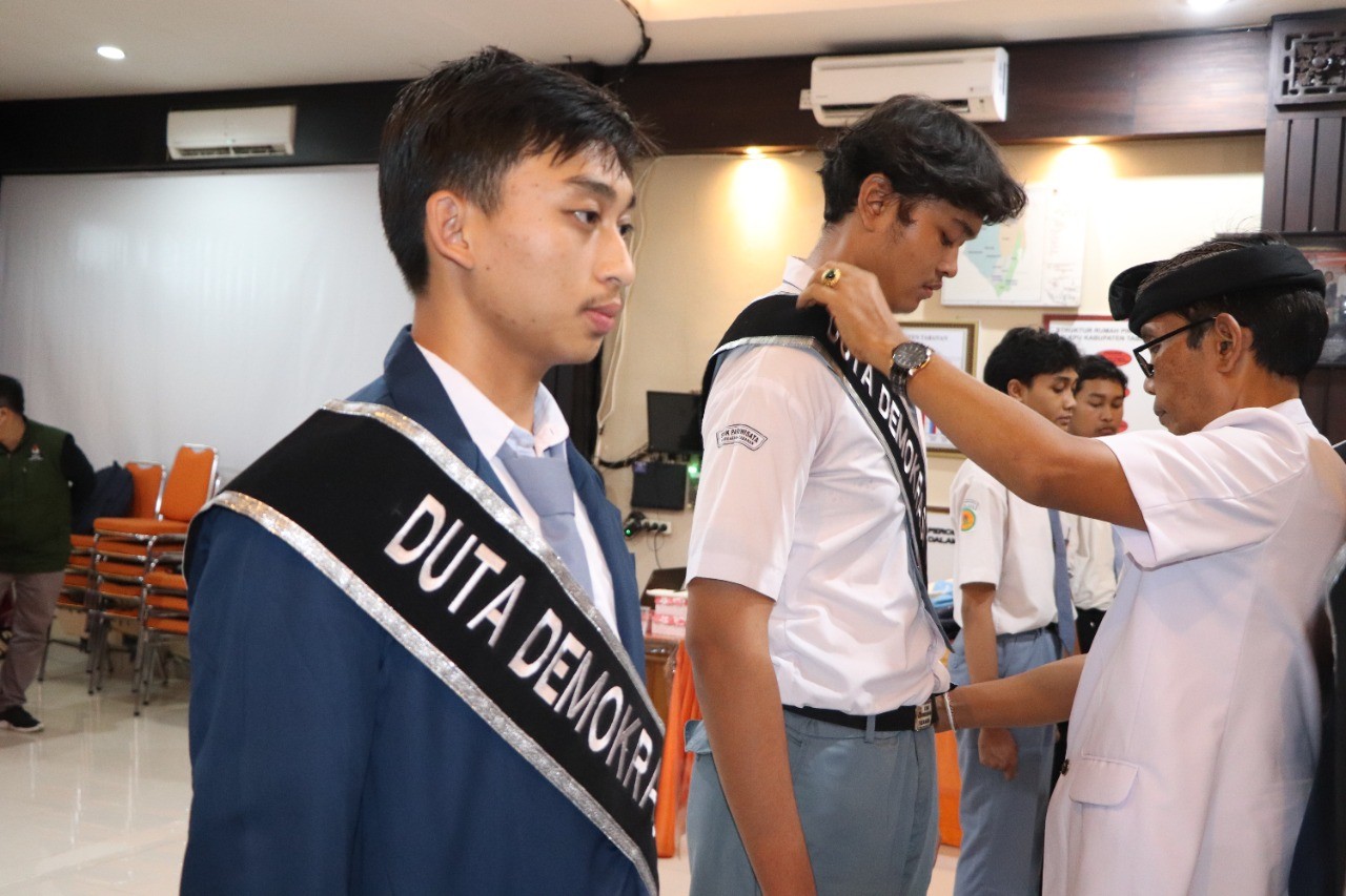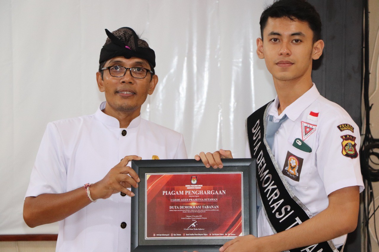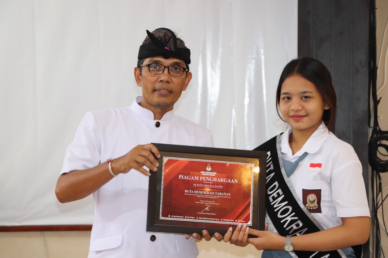 Dengan adanya Duta Demokrasi ini diharapkan tingkat partisipasi Pemilih dalam Pemilu dan Pemilihan Serentak khususnya di Kabupaten Tabanan dapat meningkat. Di penghujung acara Ketua KPU Tabanan memasangkan selempang dan memberikan Piagam Penghargaan sebagai Duta Demokrasi Tabanan. (Humas KPU Tabanan).