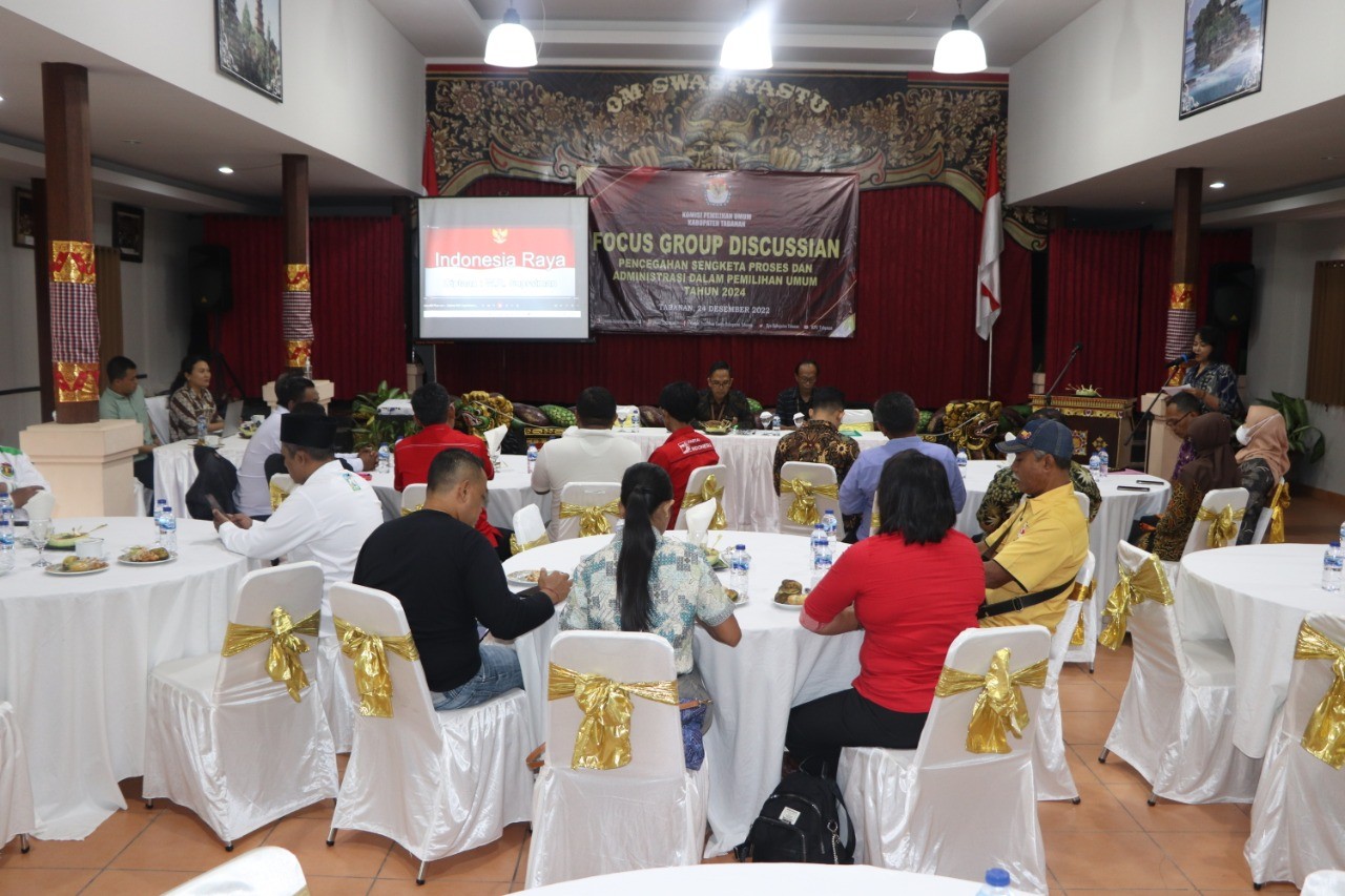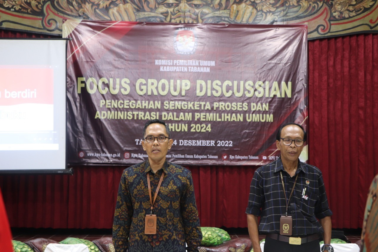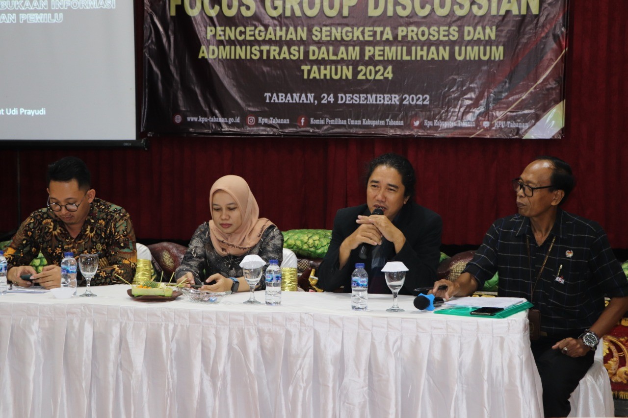 KPU Tabanan, Dangin Carik – Dalam rangka Pemilu Serentak 2024, KPU Kabupaten Tabanan selenggarakan Focus Group Discussion (FGD) pencegahan sengketa proses dan administrasi dalam Pemilu tahun 2024. Kegiatan dilangsungkan sekitar pukul 10.00 Wita di Dewi Sinta Hotel & Restaurant, Jalan Tanah Lot, Desa Beraban, Kecamatan Kediri, Kabupaten Tabanan, Sabtu ((24/12/2022).