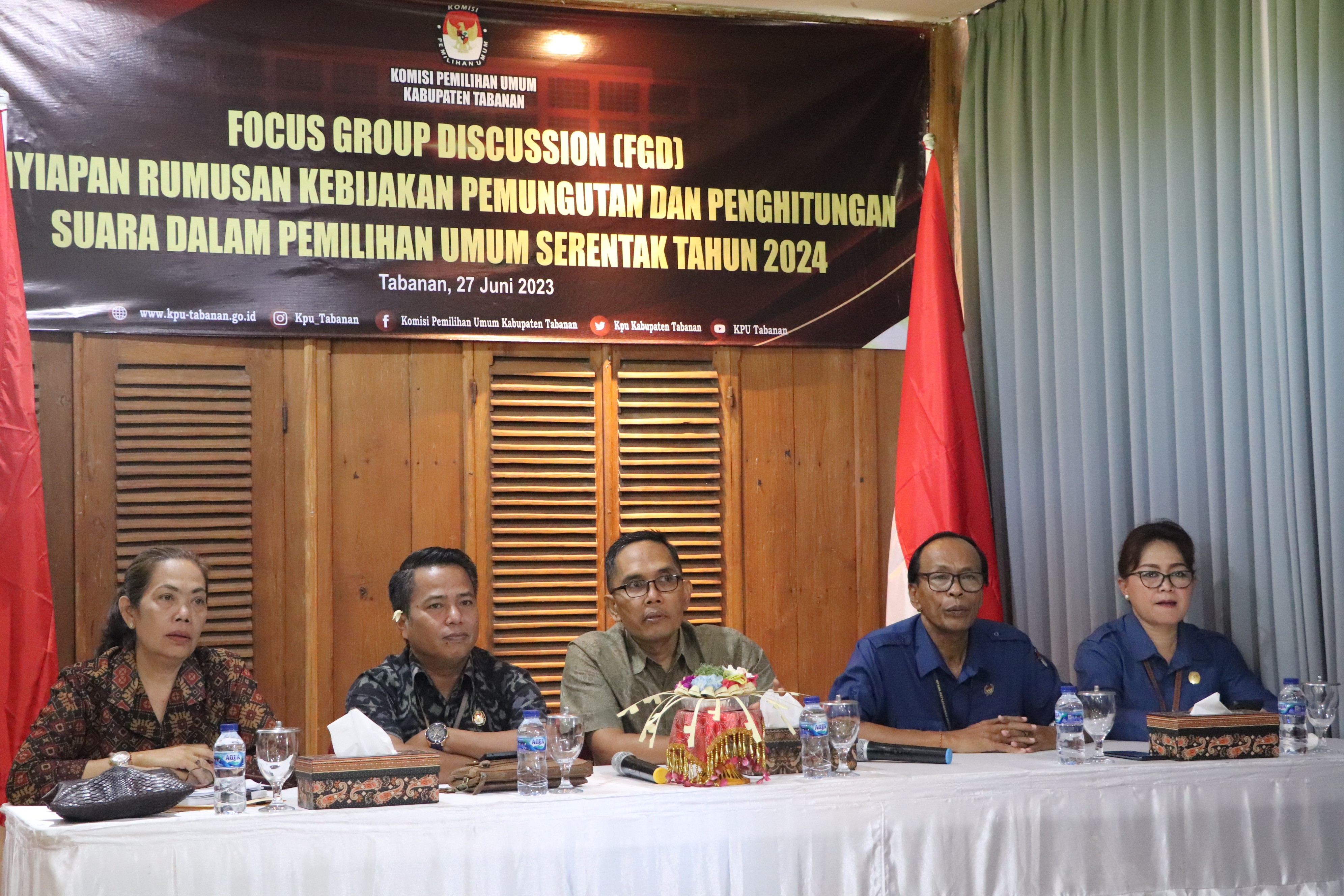 KPU Tabanan, Dangin Carik – Berkaitan dengan penyelenggaraan Pemilu Serentak yang akan digelar pada hari Rabu tanggal 14 Februari tahun 2024 mendatang, Komisi pemilihan Umum (KPU) Kabupaten Tabanan mengadakan Fokus Group Discussion Penyiapan Rumusan Kebijakan Pemungutan dan Penghitungan Suara dalam Pemilu Serentak Tahun 2024, bertempat di Warung CS Bedha, Desa Bongan, Kecamatan Tabanan, pukul 09.30 Wita, Selasa (27/06/2023).