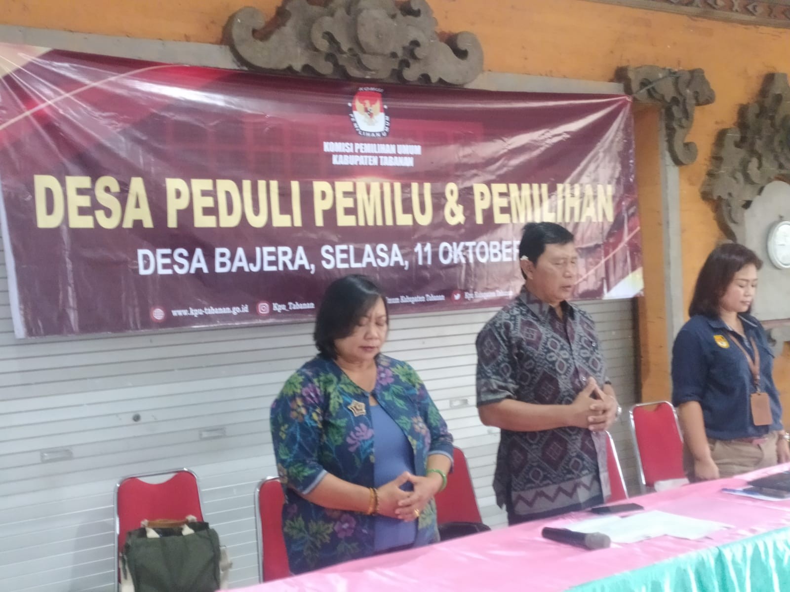 diawali menyanyikan lagu kebangsaan Indonesia Raya dan Doa bersama, dilanjutkan sambutan Perbekel Desa Bajera. “Desa Bajera diberikan kesempatan untuk mendapatkan sosialisasi pendidikan Pemilih Desa peduli Pemilu dan Pemilihan, kenapa?....karena tingkat partisipasi Pemilih di Desa Kita kurang. Adik-adik Kader Demokrasi nanti akan menjadi ujung tombak dan penerus Desa dan Bangsa, semoga acara berjalan aman dan lancar,” ungkap I Putu Sukarata.