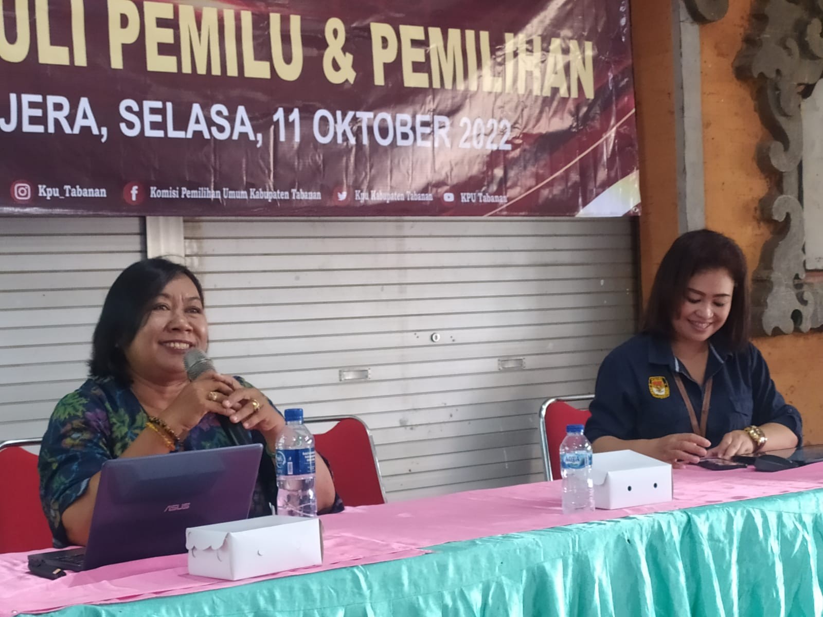 Hadir dari KPU Tabanan untuk menyampaikan materi yakni Anggota KPU Tabanan Ketua Divisi Sosialisasi, Pendidikan Pemilih, Parmas dan SDM, Ni Putu Suaryani didampingi beberapa Pegawai Sekretariat KPU Tabanan. Untuk Narasumber lainnya yaitu mantan Ketua KPU Tabanan, Luh Darayoni. Hadir juga Perbekel Desa Bajera, I Putu Sukarata serta para Kader Demokrasi Desa Bajera sejumlah 25 Orang.
