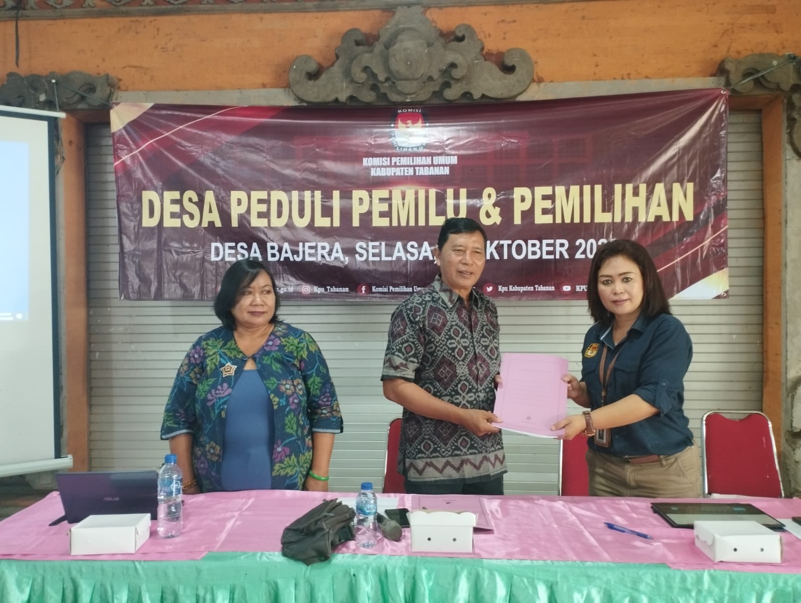 Dalam kesempatan itu juga dilaksanakan penandatanganan Perjanjian Kerja Sama antara KPU Kabupaten Tabanan dengan Desa Bajera tentang pelaksanaan kegiatan Desa Peduli Pemilu dan Pemilihan dalam rangka Pemilu tahun 2024.