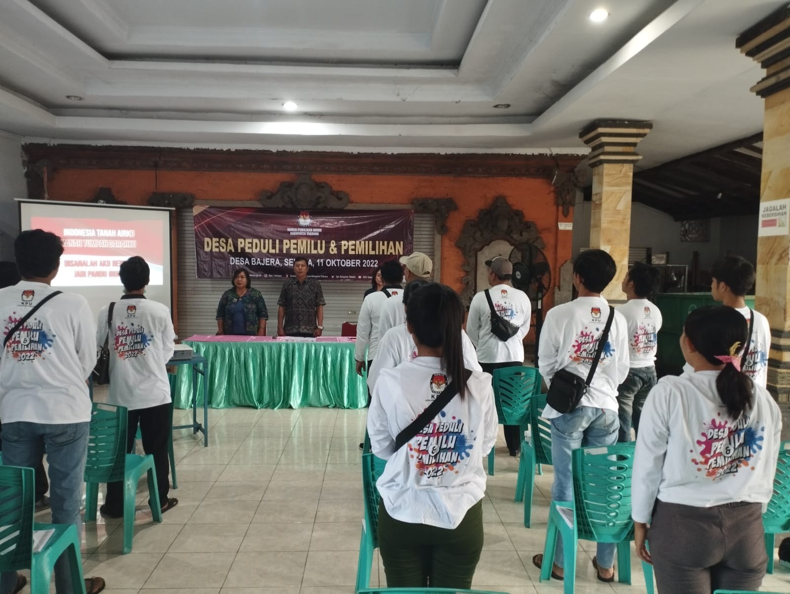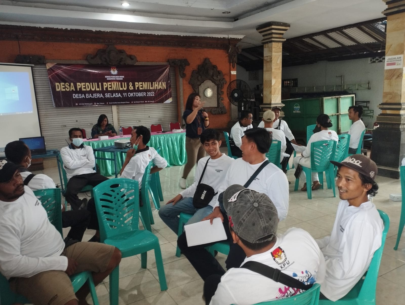 KPU Tabanan, Dangin Carik – Dalam rangka Pemilu Serentak tahun 2024, Komisi Pemilihan Umum (KPU) Kabupaten Tabanan mengadakan kegiatan sosialisasi melalui pendidikan Pemilih Desa Peduli Pemilu dan Pemilihan (DP3). Dari lima Desa yang akan dijadikan pilot project oleh KPU Tabanan, untuk pertama kalinya KPU Tabanan mengunjungi Desa Bajera yang terletak di Kecamatan Selemadeg, Kabupaten Tabanan. Kegiatan DP3 dimulai pukul 09.00 Wita, bertempat di Kantor Perbekel Desa Bajera, Selasa (11/10/2022).