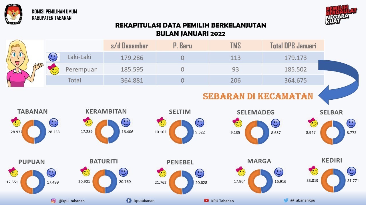 KPU Tabanan, Dangin Carik – Secara rutin pada setiap bulan Jajaran Komisi Pemilihan Umum (KPU) Kabupaten Tabanan melakukan rekapitulasi jumlah Pemilih di Kabupaten Tabanan melalui program Pemutakhiran Data Pemilih Berkelanjutan (PDPB). Untuk bulan Januari tahun 2022, KPU Tabanan berhasil merekap jumlah Pemilih sebanyak 364.675 Pemilih dengan rincian Laki-Laki sebanyak 179.173 Pemilih dan sejumlah 185.502 merupakan Pemilih Perempuan.