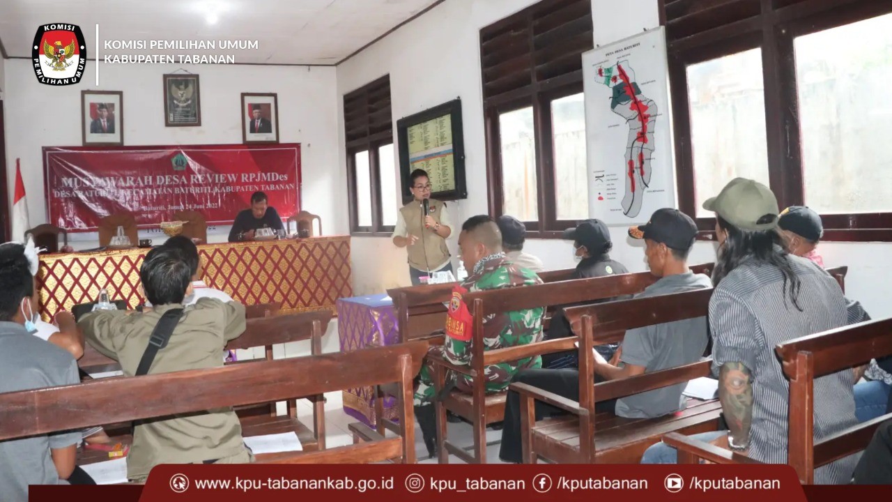 KPU Tabanan, Dangin Carik – Anggota Komisi Pemilihan Umum (KPU) Kabupaten Tabanan Ketua Divisi Sosialisasi, Pendidikan Pemilih, Parmas dan SDM, Ni Putu Suaryani melakukan perjalanan ke Desa Baturiti, Kecamatan Tabanan untuk menyampaikan sosialisasi bertempat di Ruang Rapat Kantor Perbekel Desa Baturiti, Jumat (24/06/2022).