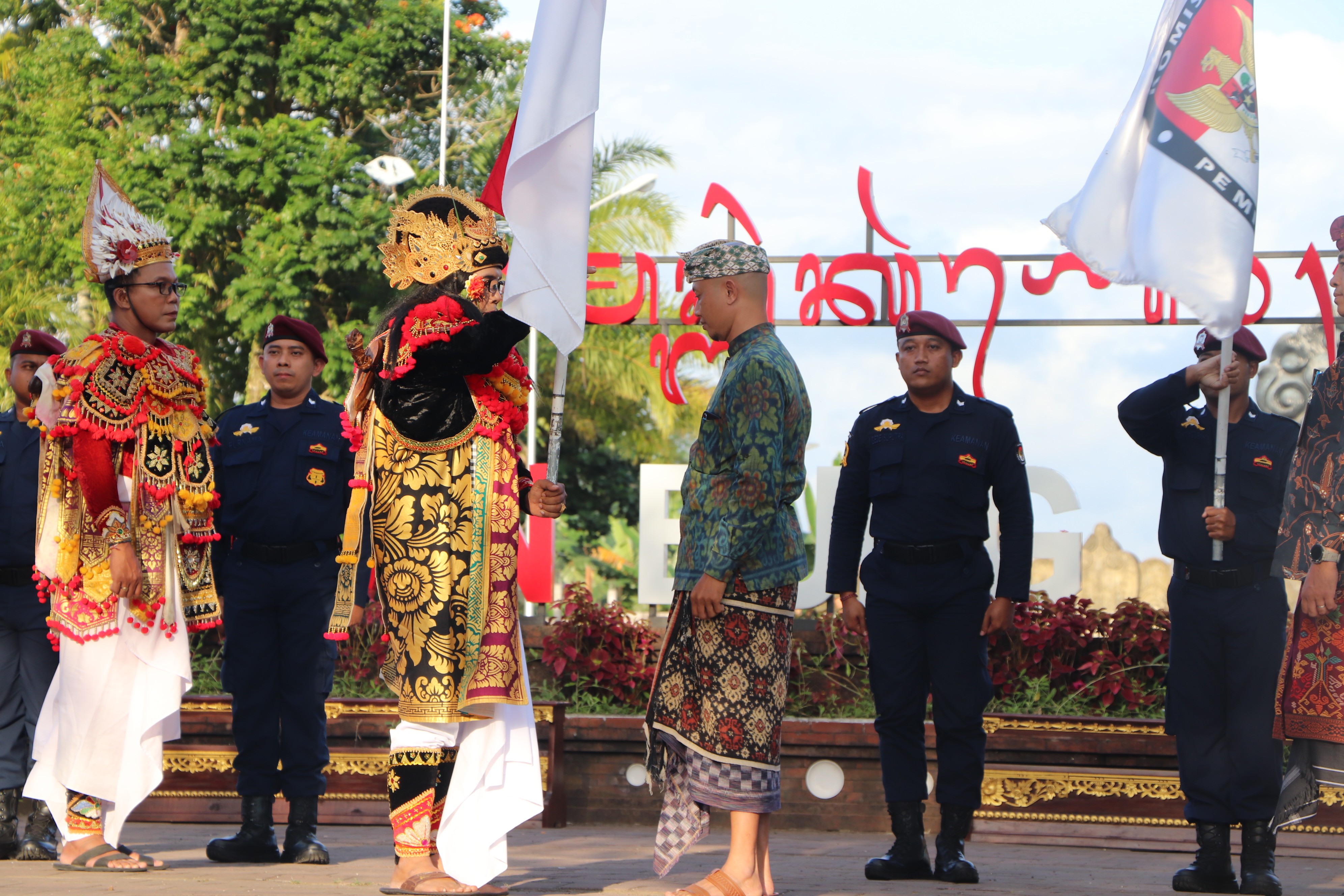 Serah Terima Bendera Parpol Kirab Pemilu 2024 dari KPU Badung kepada KPU Tabanan melibatkan Paskibra (bekerjasama dengan Dinas Pendidkan Kabupaten Tabanan) dan melibatkan pengamanan dalam Jagat Saksana KPU Tabanan.