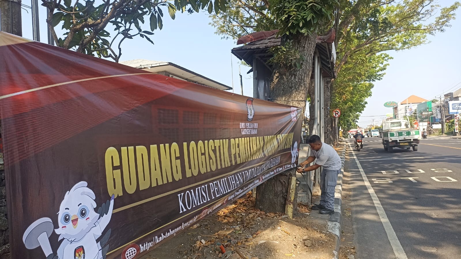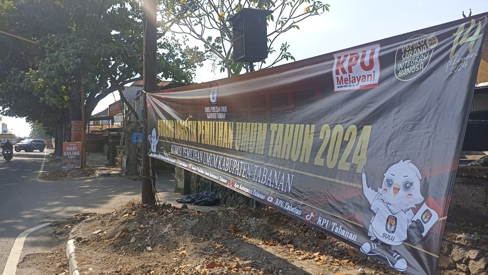 Spanduk bertuliskan gudang logistik KPU Tabanan dalam rangka Pemilu Serentak 2024 juga telah dipasang oleh KPU Tabanan.
