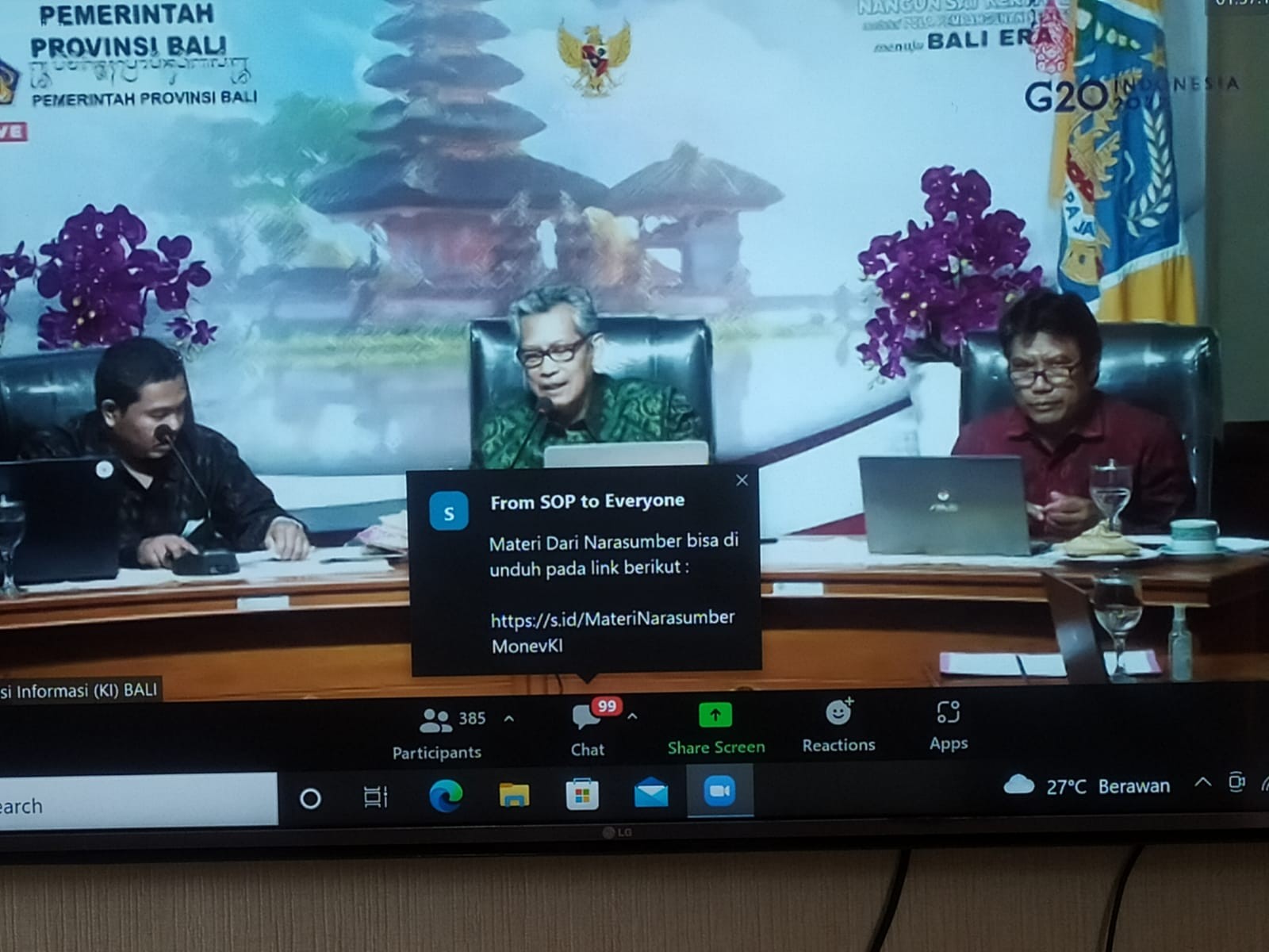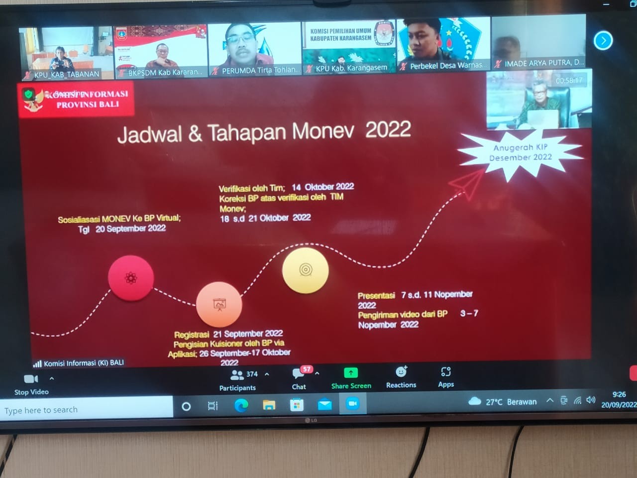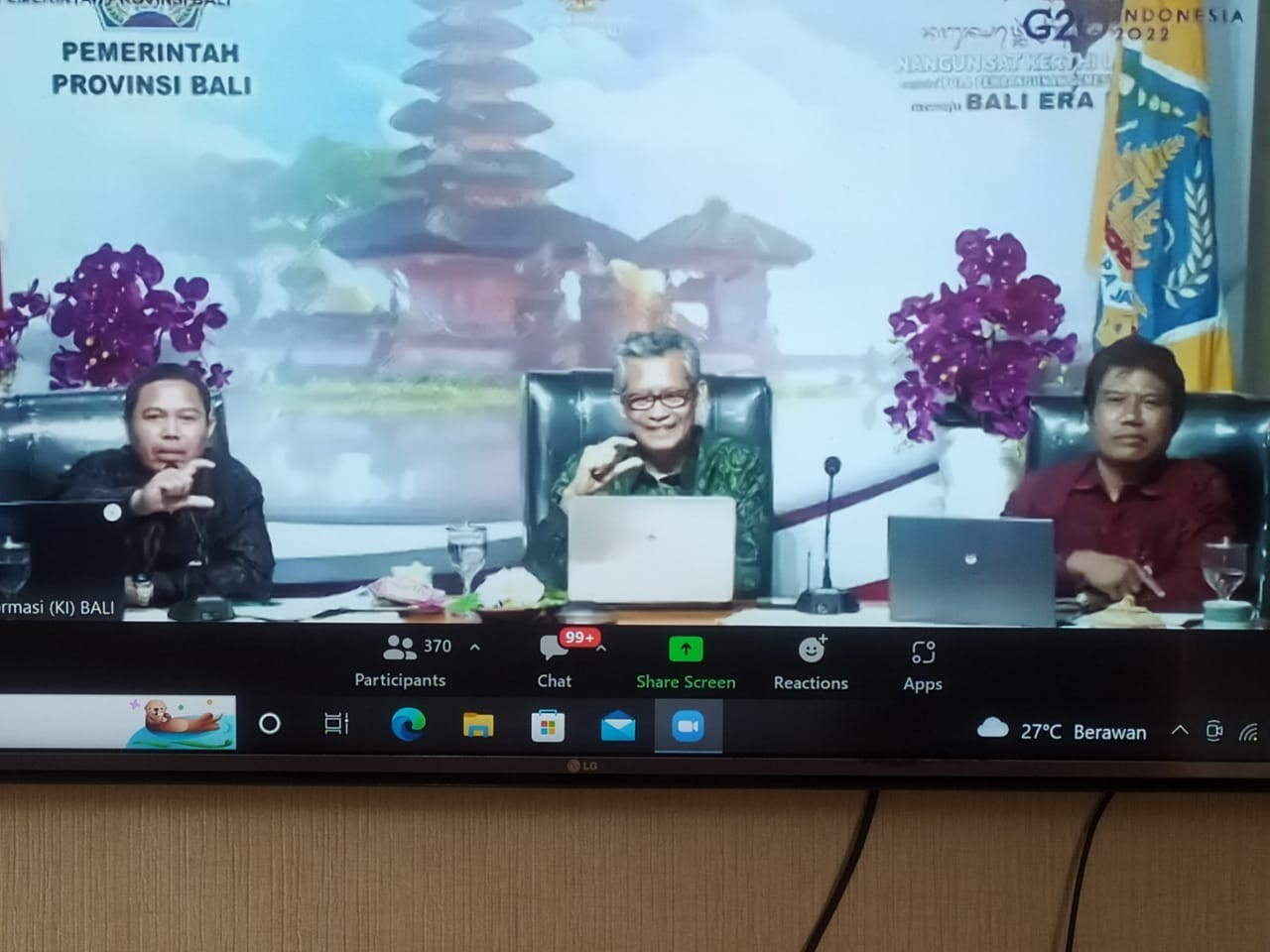 KPU Tabanan, Dangin Carik – Divisi Sosialisasi Komisi Pemilihan Umum (KPU) Kabupaten Tabanan tepatnya Sub Bagian Teknis Penyelenggaraan Pemilu, Partisipasi dan Hubungan Masyarakat Sekretariat KPU Tabanan menghadiri Zoom Meeting sosialisasi monitoring dan evaluasi keterbukaan informasi Badan Publik tahun 2022, bertempat di ruang Rapat Kantor KPU Tabanan, pukul 09.00 Wita, Selasa (20/09/2022).
