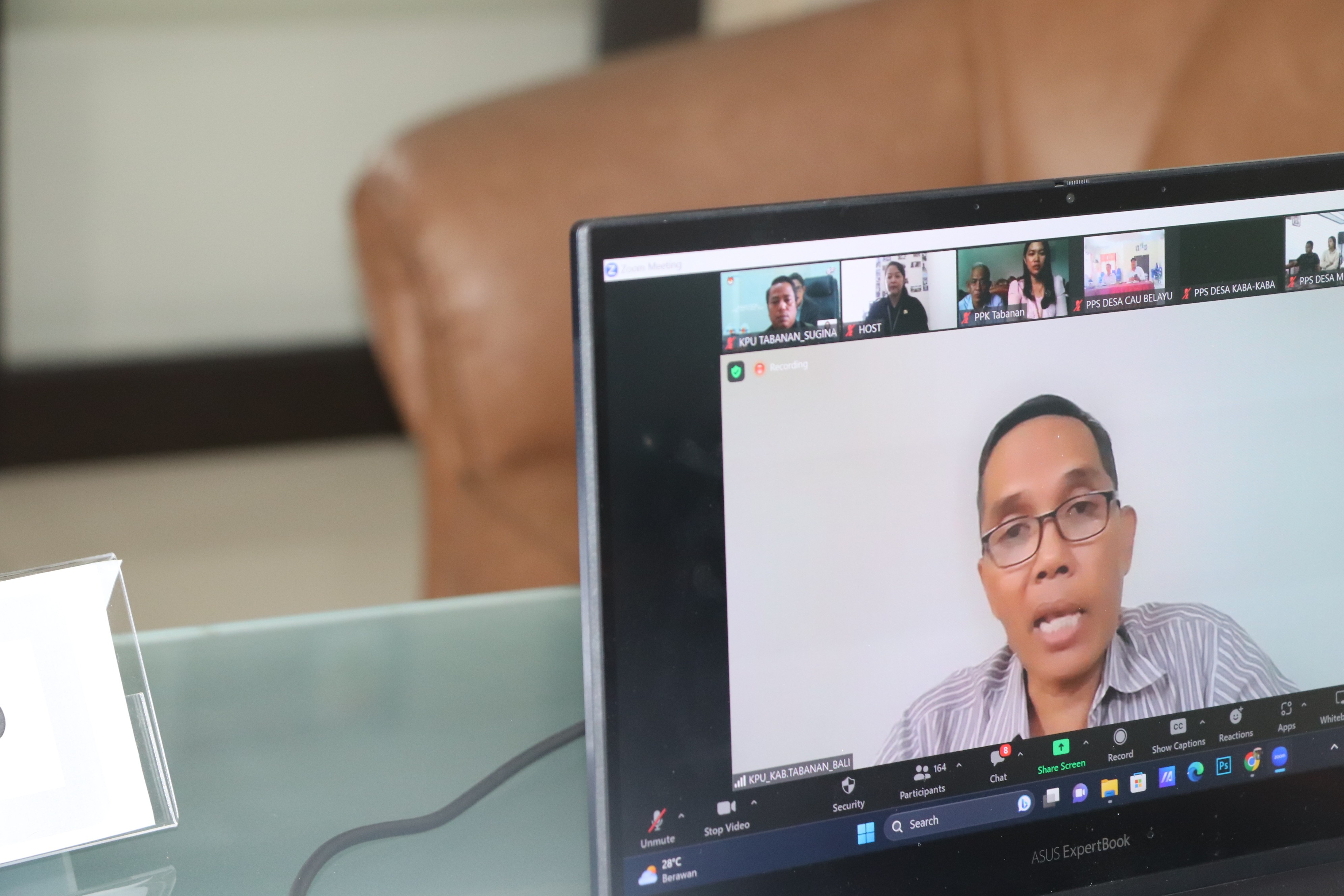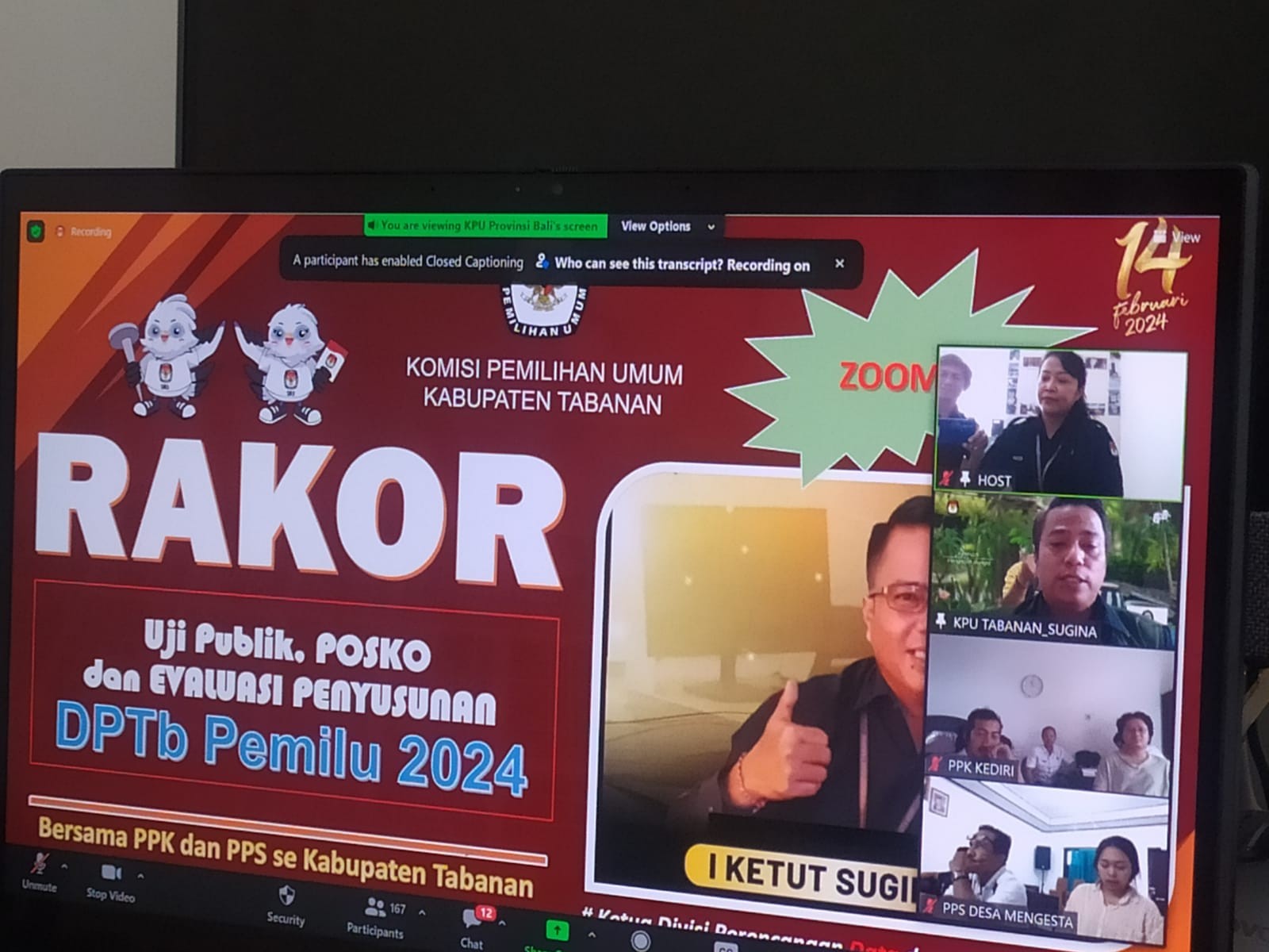 Dari KPU Tabanan sendiri bergabung dalam Zoom Meeting yakni Ketua KPU Tabanan, I Gede Putu Weda Subawa serta Anggota KPU Tabanan Ketua Divisi Perencanaan, Data dan Informasi, I Ketut Sugina. Turut hadir Sekretaris KPU Tabanan, I Nyoman Swandika dan Kasubbag Perencanaan, Data dan Informasi pada Sekretariat KPU Tabanan, I Made Rika Hendrawan. Kegiatan ini dipandu oleh seorang pembawa acara, I G A Puriyanti.