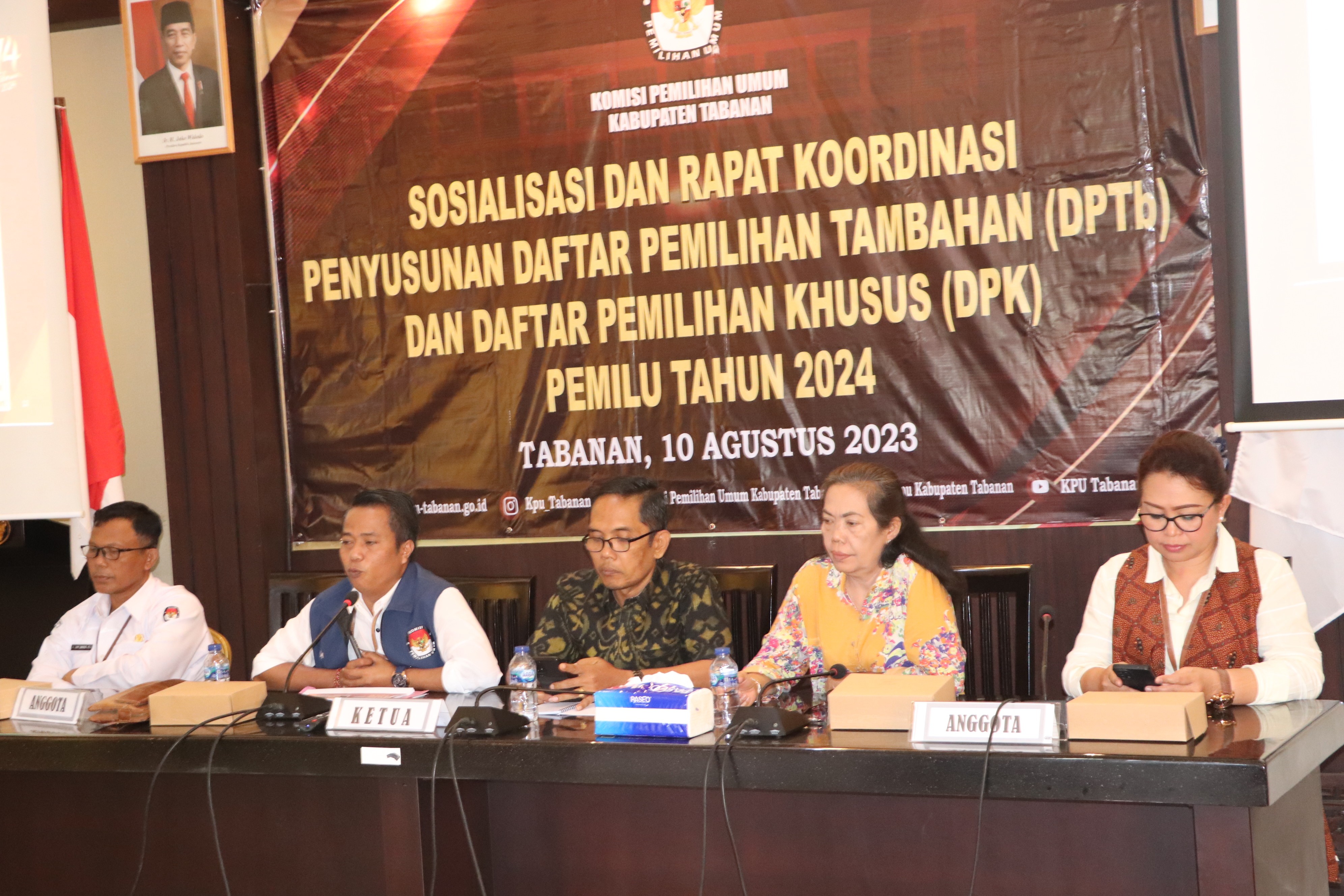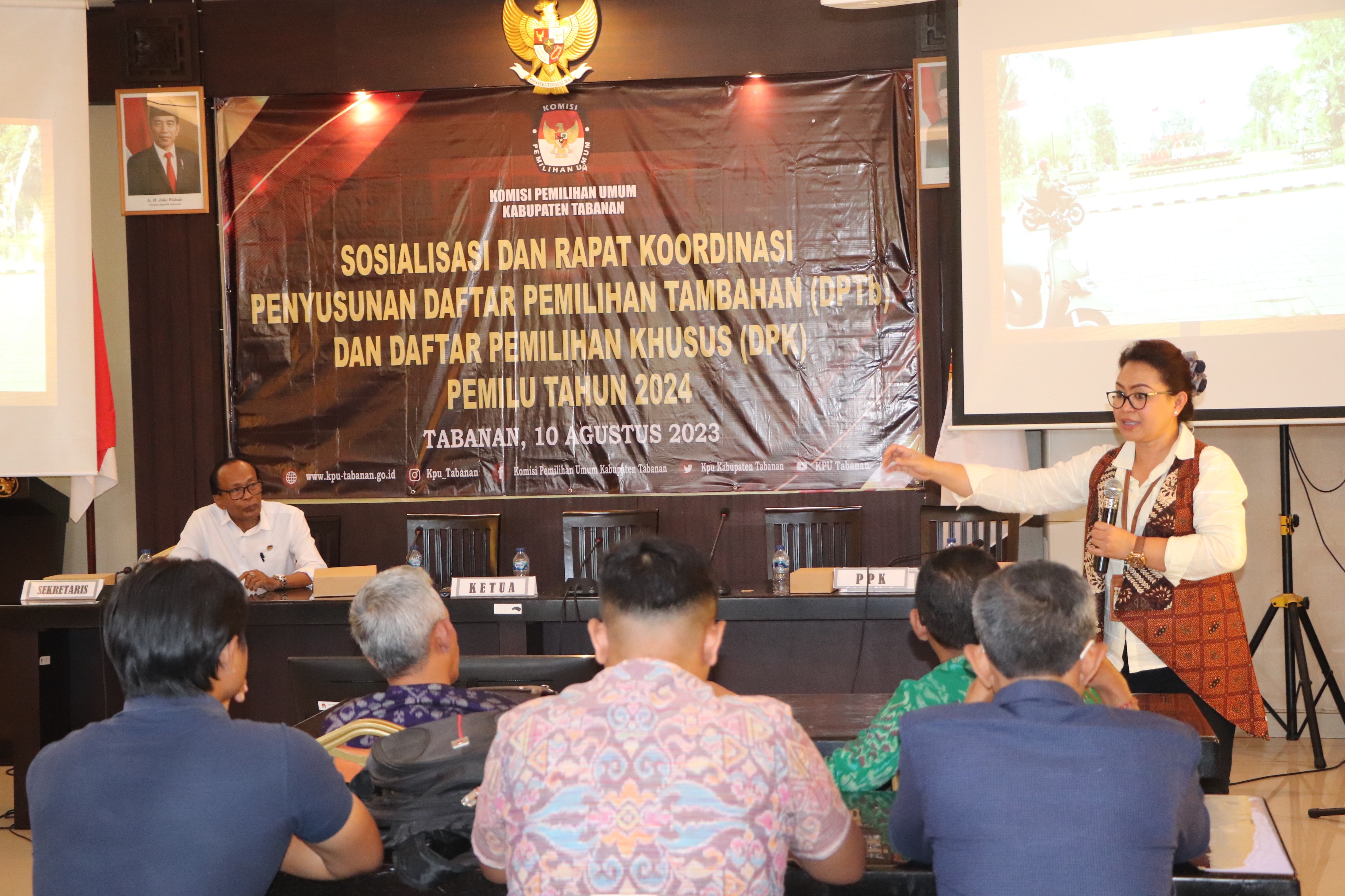 KPU Tabanan, Dangin Carik – Dalam rangka Tahapan Pemilu Serentak 2024, bertempat di ruang KPU Kabupaten, Kamis, (10/08/2023), pukul 09. 30 Wita, KPU Kabupaten Tabanan melaksanakan sosialisasi dan rapat koordinasi penyusunan Daftar Pemilih Tambahan (DPTb) dan Daftar Pemilih Khusus (DPK) Pemilu 2024 dengan Pemangku Kepentingan /Stakeholder yang ada di Kabupaten Tabanan.
