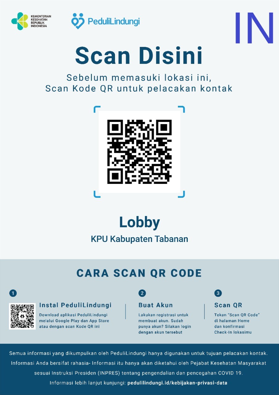 Ketua KPU Tabanan, I Gede Putu Weda Subawa,pada Jumat, (08/10/2021) membenarkan pihaknya menerapkan pemindaian kode batang /scan Barcode aplikasi Pedulilindungi untuk staf dan tamu yang hendak berkunjung ke Kantor KPU Tabanan. “Sesuai arahan Pimpinan KPU Provinsi Bali dan juga sejalan dengan arahan Pemerintah, Kami KPU Tabanan tidak mau gegabah meskipun pandemi sudah melandai, Kita tetap menerapkan prokes dengan ketat mulai dari wajib masker, hand sanitizer, jaga jarak hingga scan QR code PeduliLindungi,” ucapnya. Hal itu kata dia tidak lain guna menjaga kesehatan semua pihak mulai dari staf hingga tamu yang berkunjung, terlebih lagi kini Jajarannya telah melaksanakan berbagai persiapan untuk menyambut tahapan Pemilu dan Pemilihan Serentak tahun 2024 mendatang.