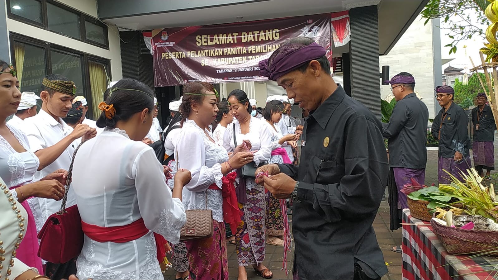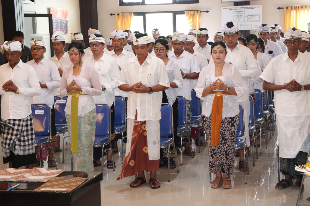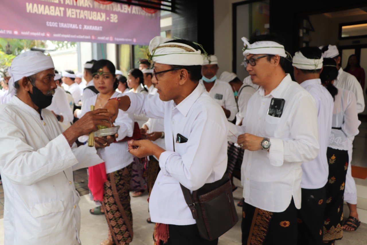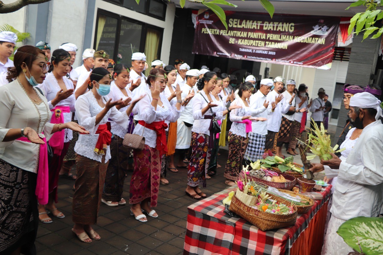 Sekitar pukul 08.00 Wita, bertempat di halaman Kantor KPU Tabanan, Jalan PB. Sudirman, No. 1 Dangin Carik, Tabanan, Senin (02/01/2023), seluruh Anggota PPK yang akan diambil sumpahnya melaksanakan upacara Mejaya-Jaya dipimpin oleh Seorang Rohaniwan yaitu prosesi dalam Agama Hindu yang bertujuan membersihkan pengaruh-pengaruh negatif atau mala dalam diri seseorang agar pikiran, perkataan dan prilakunya berjalan sesuai ajaran agama.