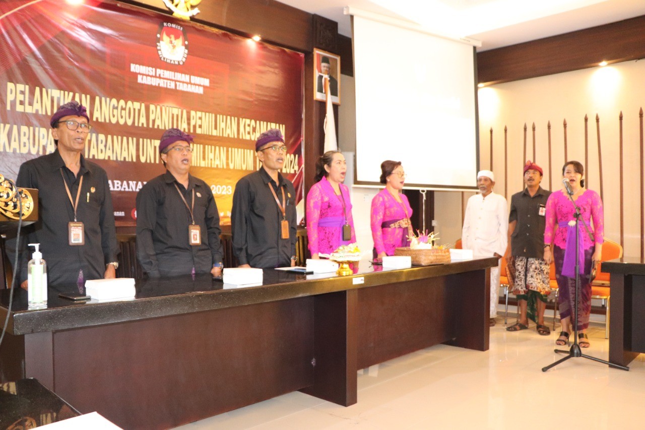 Selanjutnya pada pukul 10.00 Wita dilanjutkan pengambilan sumpah dan pelantikan Anggota PPK yang dilangsungkan di ruang rapat Kantor KPU Tabanan. Hadir dalam kesempatan itu Sekda Kabupaten Tabanan, Kapolres Tabanan serta perwakilan dari Kodim 1619 Tabanan.