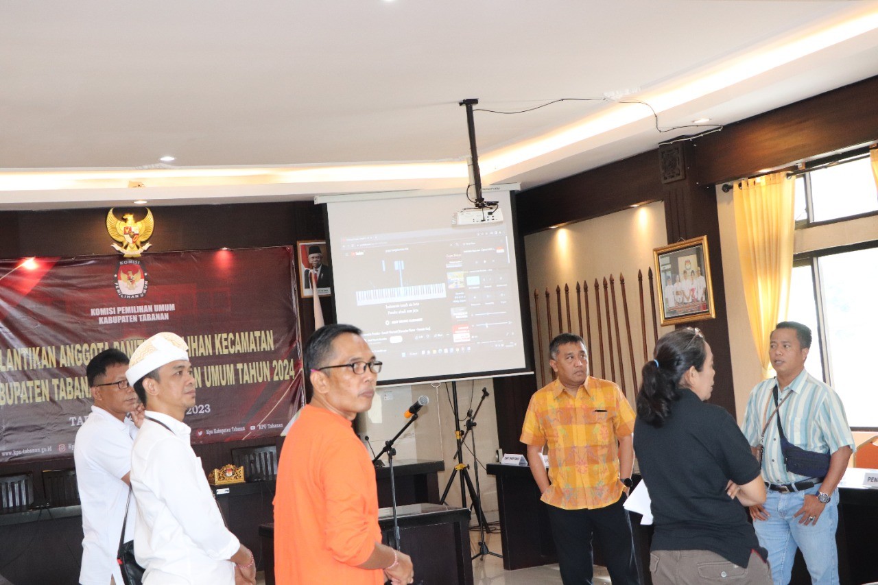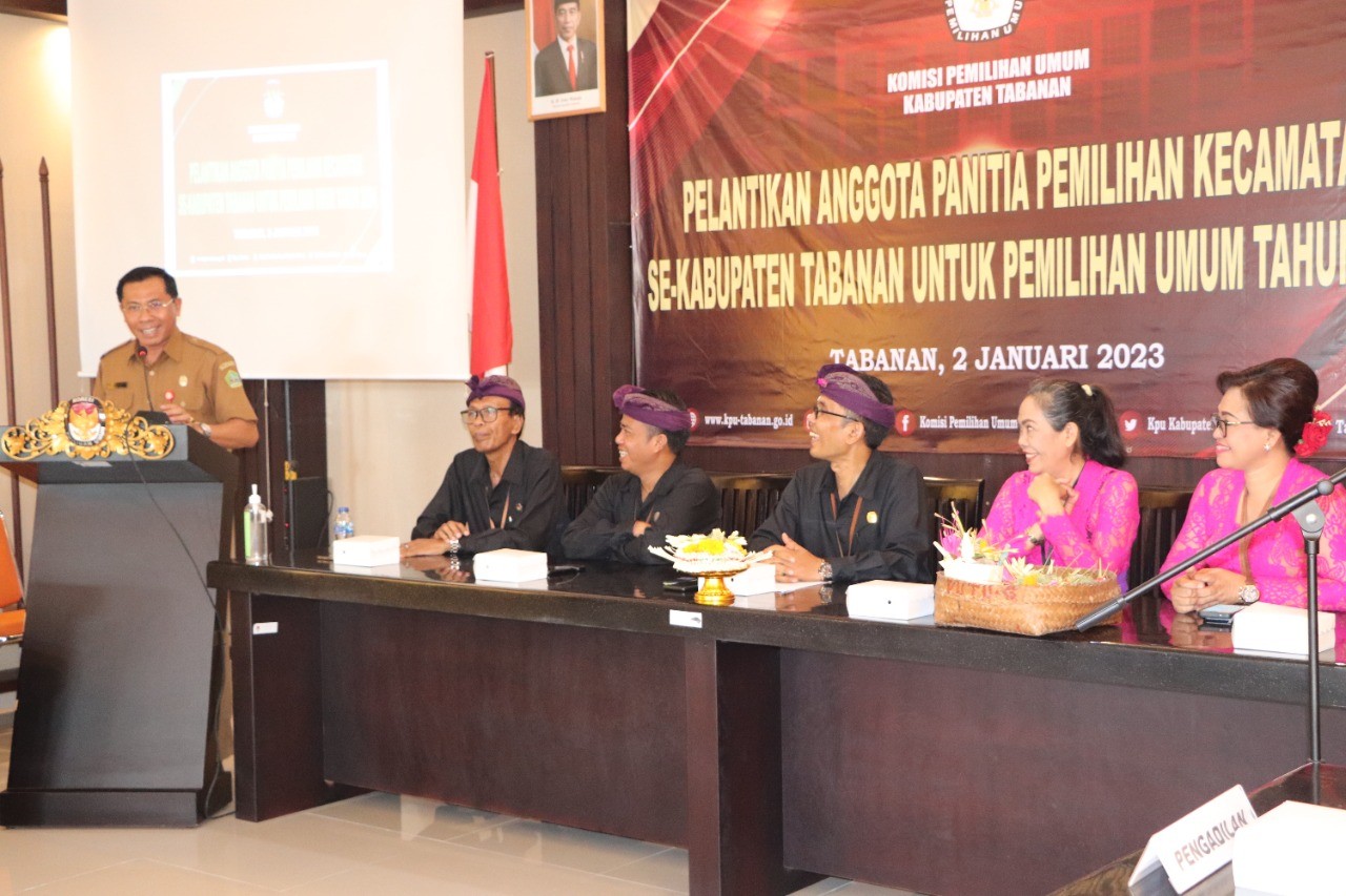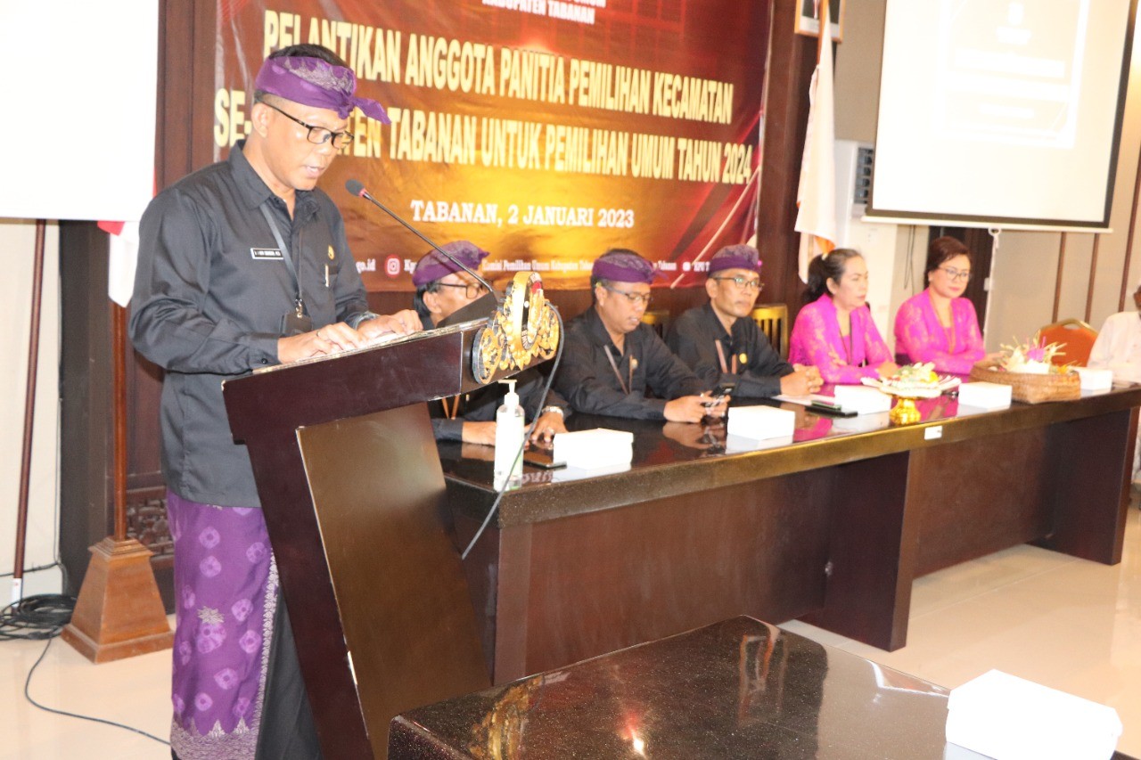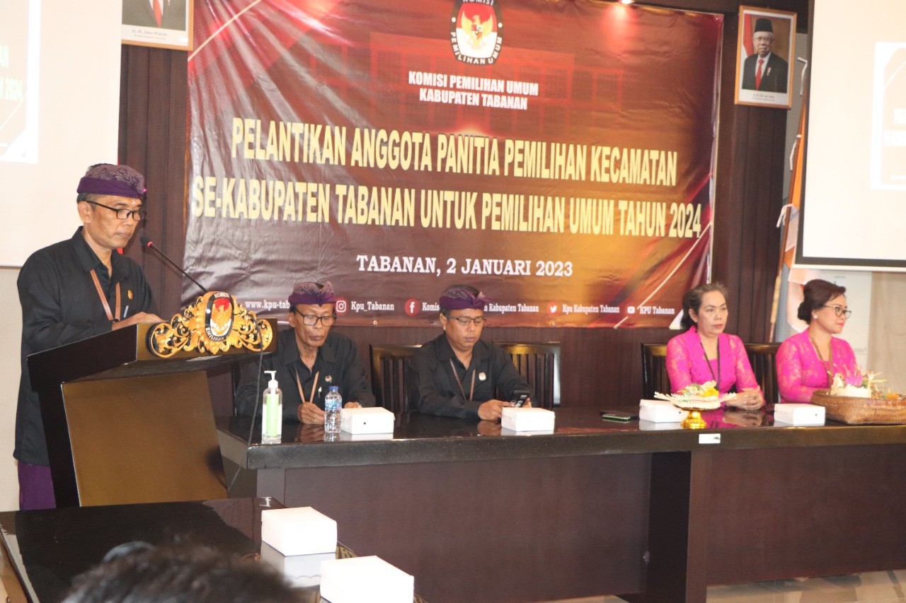 KPU Tabanan, Dangin Carik – Setelah melalui penjaringan yang ketat dalam seleksi pembentukan Badan Ad Hoc di tingkat Kecamatan, Komisi Pemilihan Umum (KPU) Kabupaten Tabanan akhirnya melaksanakan Pelantikan terhadap 50 Orang Anggota Panitia Pemilihan Kecamatan (PPK) dari sejumlah 10 Kecamatan Se-Kabupaten Tabanan untuk Pemilihan Umum Serentak tahun 2024.