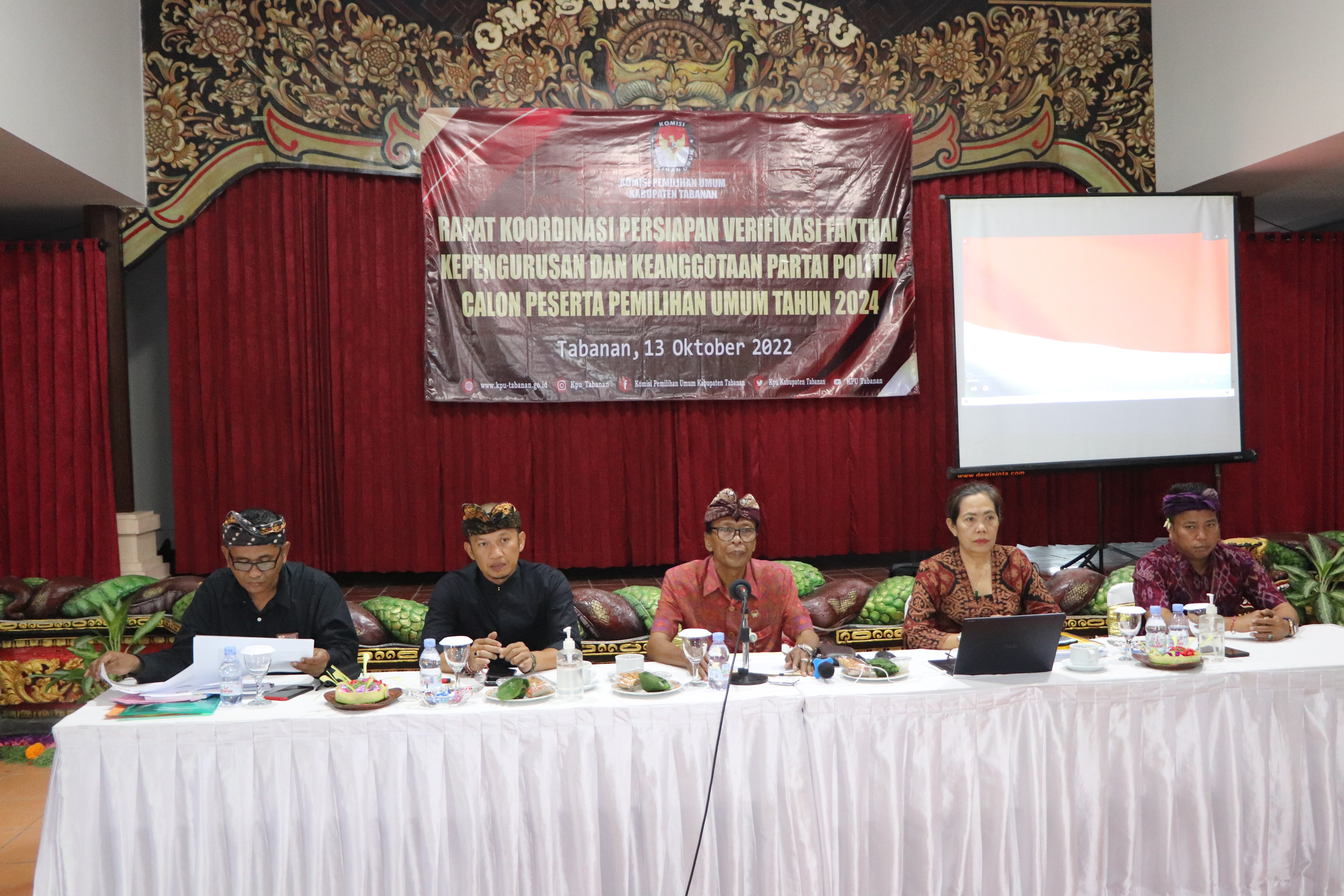 KPU Tabanan, Dangin Carik – Dengan berpedoman pada Peraturan KPU Nomor 3 Tahun 2022 dan Keputusan KPU Nomor 384 Tahun 2022 maka KPU Kabupaten Tabanan menyelenggarakan Rapat koordinasi persiapan verifikasi faktual kepengurusan dan keanggotaan Partai Politik Calon Peserta Pemilu tahun 2024, pukul 08.30 Wita bertempat di Restoran Dewi Sinta, Jalan Tanah Lot, Beraban, Kecamatan Kediri, Tabanan, Kamis (13/10/2022).