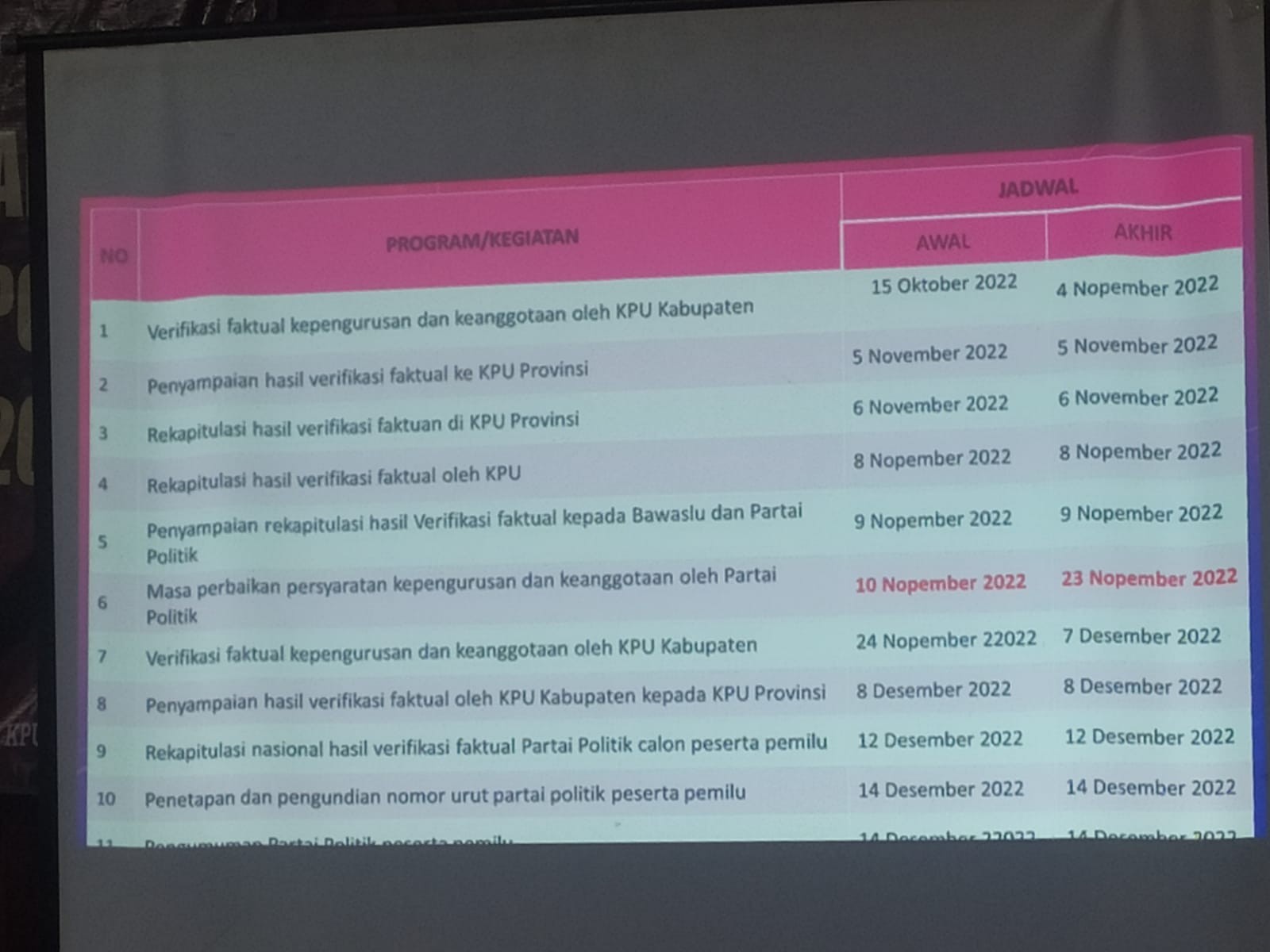Sedangkan Luh Made Sunadi dalam penyampaian materinya mengungkapkan, “Tanggal 14 Oktober KPU RI sudah akan mengumumkan Parpol mana yang telah lolos verifikasi administrasi. Verifikasi faktual kepengurusan dan keanggotaan Parpol akan Kita mulai tanggal 15 Oktober 2022 – 4 November tahun 2022.” Dalam kesempatan ini, Sunadi juga menjelaskan terkait interval. (Humas KPU Tabanan).