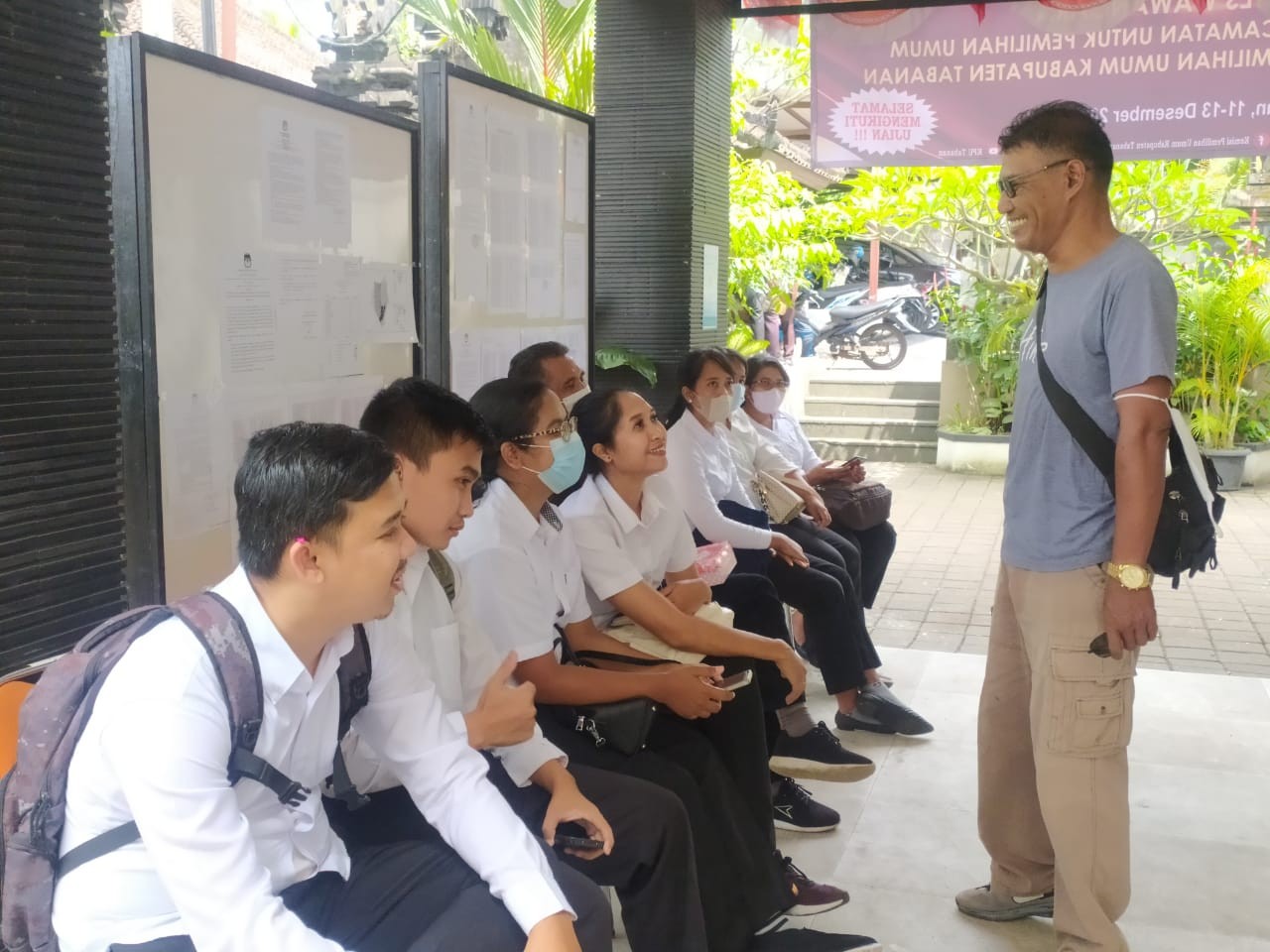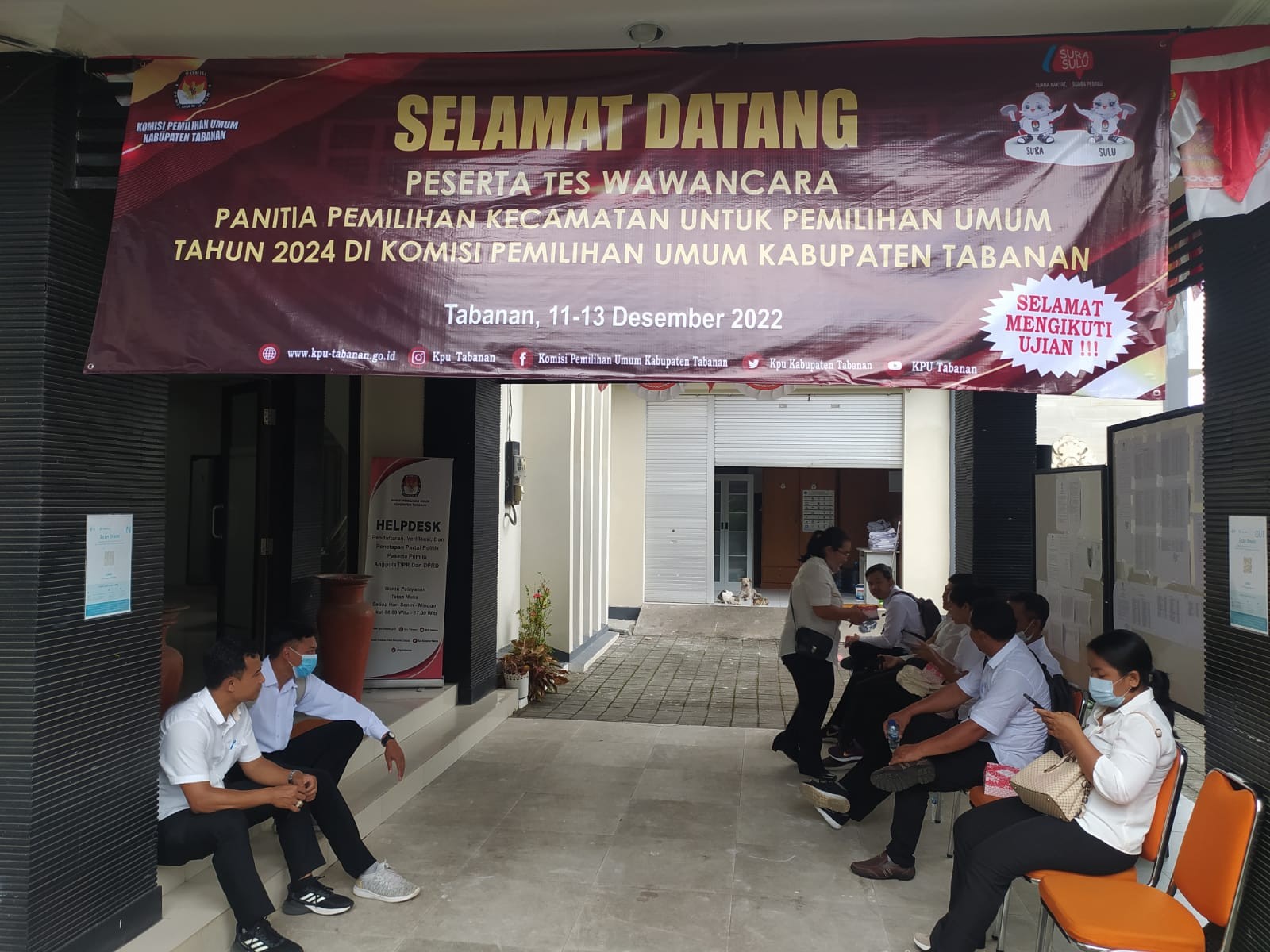 KPU Tabanan, Dangin Carik – Terkait pembentukan Badan Ad Hoc tingkat Kecamatan dalam rangka Pemilu Serentak yang akan diselenggarakan hari Rabu tanggal 14 Februari 2024, KPU Kabupaten Tabanan melaksanakan seleksi wawancara terhadap Calon Anggota Panitia Pemilihan Kecamatan (PPK) yang dinyatakan lulus tahap seleksi tertulis. Kegiatan seleksi wawancara dilaksanakan di Kantor KPU Tabanan, mulai pukul 08.00 Wita, Minggu (11/12/2022).