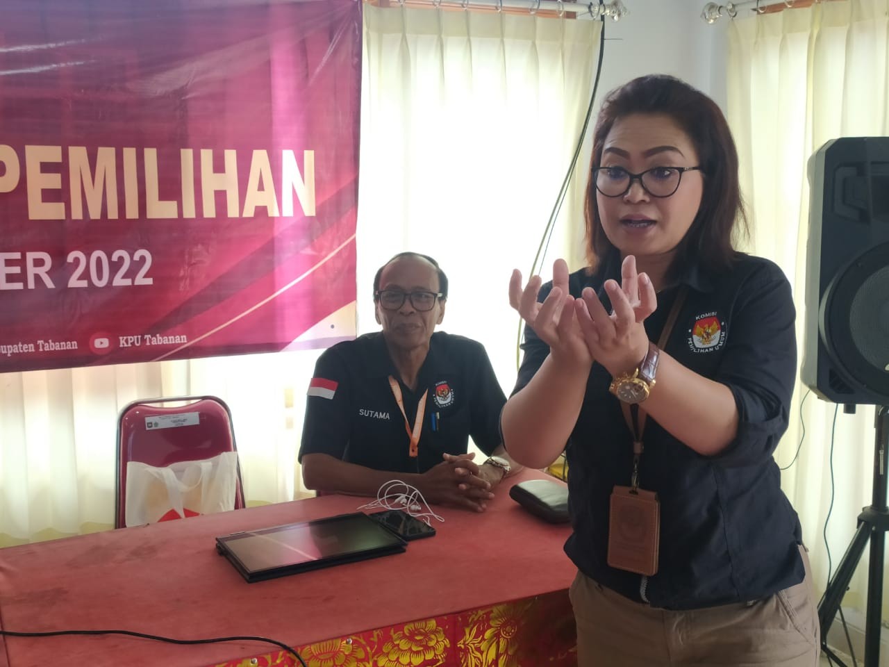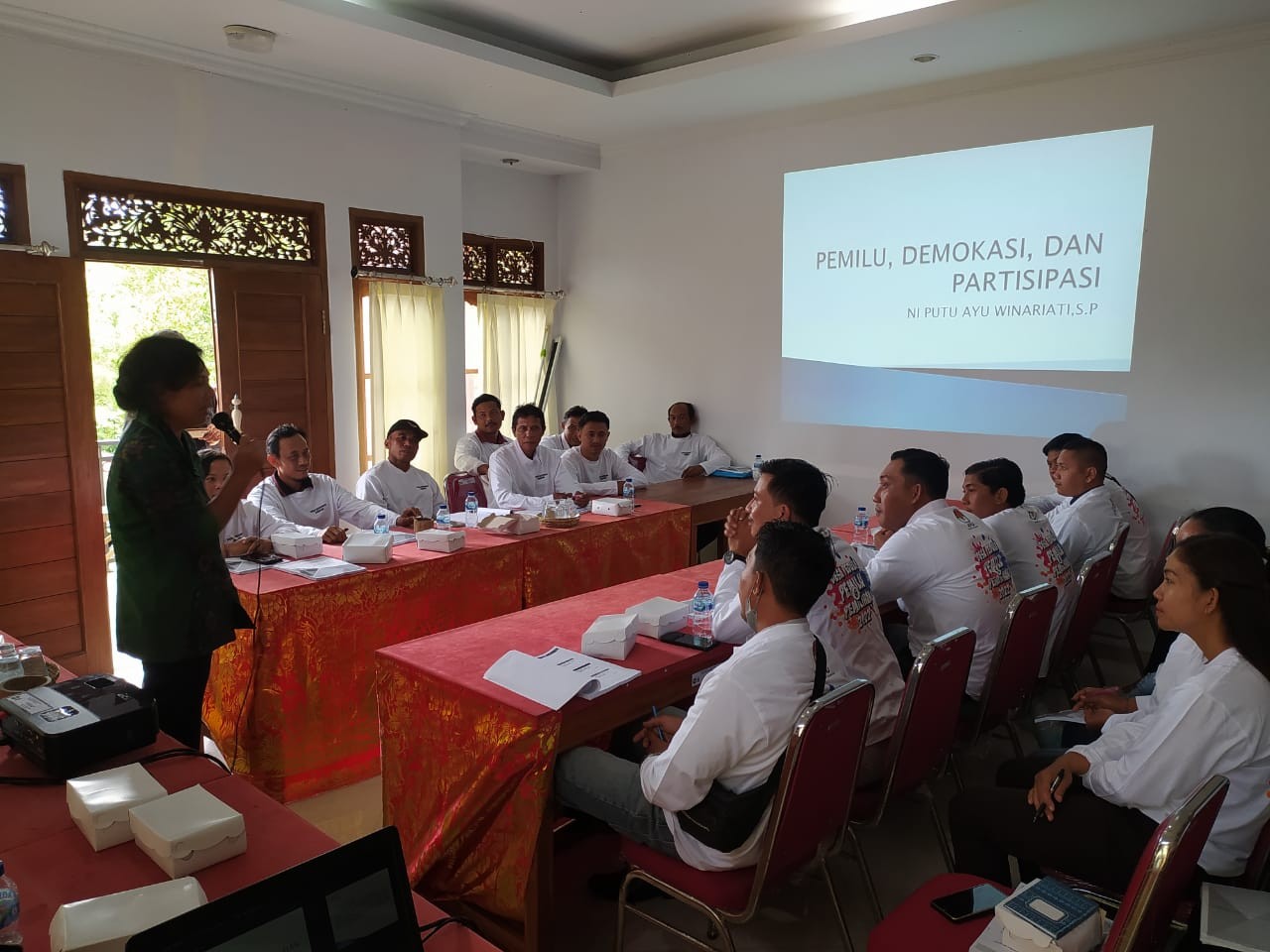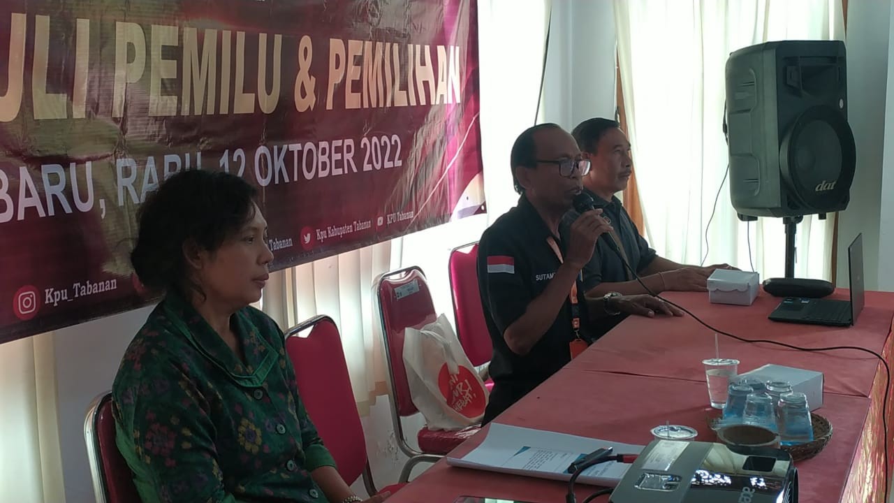 Hadir untuk menyampaikan materi dari KPU Tabanan yaitu Anggota KPU Tabanan Ketua Divisi Sosialisasi, Pendidikan Pemilih, Parmas dan SDM, Ni Putu Suaryani didampingi beberapa Pegawai Sekretariat KPU Tabanan. Tampak juga PLh. Ketua KPU Tabanan, I Wayan Sutama yang hadir untuk monitoring sekaligus memberikan arahan.