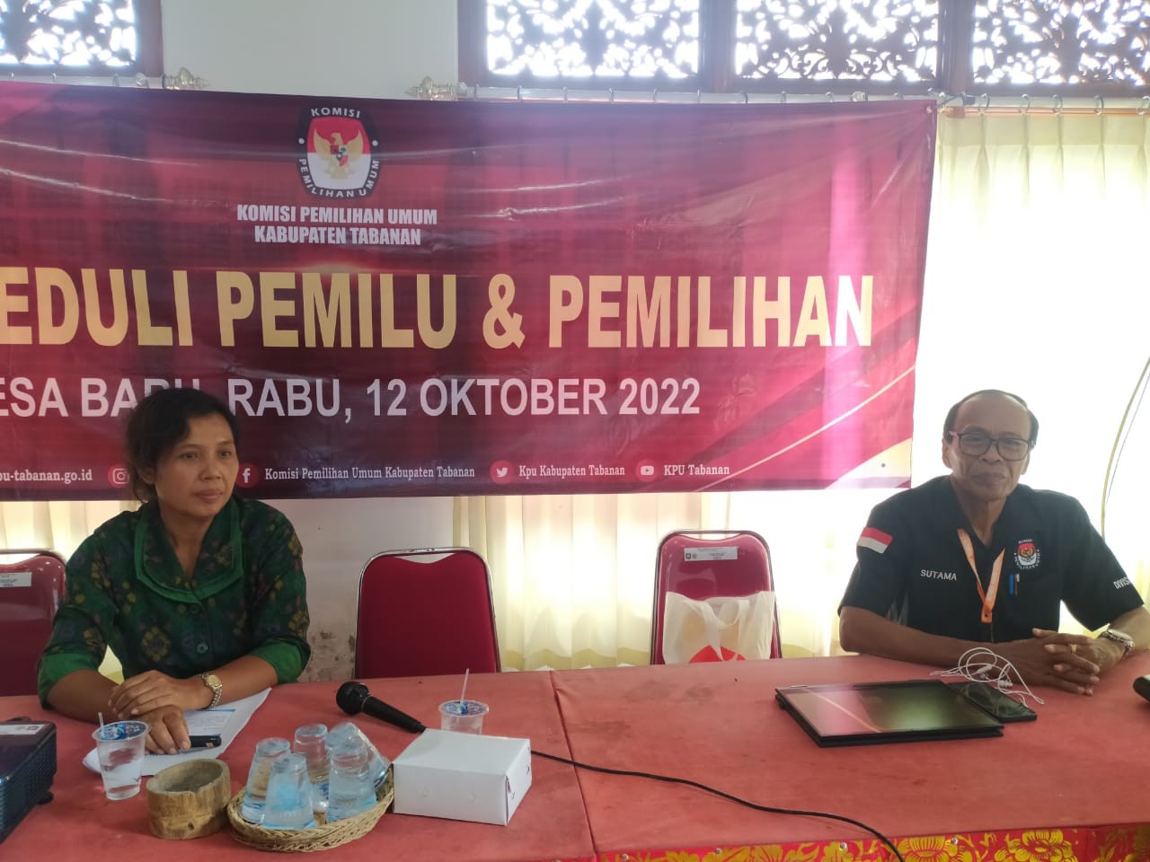 Narasumber yang diundang KPU Tabanan pada kesempatan ini adalah mantan Komisioner KPU Provinsi Bali, Ni Putu Ayu Winariati. Terlihat juga Perbekel Desa Baru, I Made Suarjana dan Bhabinkamtibmas Desa Baru serta para Kader Demokrasi Desa Baru sejumlah 25 Orang.