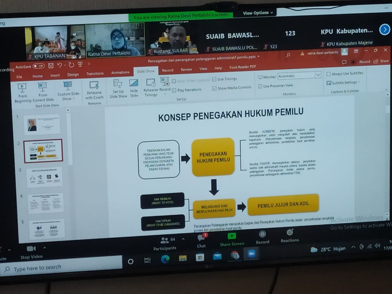 Turut hadir Kasubbag Hukum pada Sekretariat KPU Tabanan, I Made Suartika. “Rapat online ini diselenggarakan KPU Provinsi Sulawesi Barat,” kata Sutama. Terlihat hadir Komisioner KPU RI dan Pimpinan Bawaslu RI. “Jenis pelanggaran dengan angka paling tinggi pada setiap Pemilu adalah pelanggaran administrasi dan netralitas ASN,” ungkap Divisi Penindakan Bawaslu RI, DR. Ratna Dewi Pettalolo.