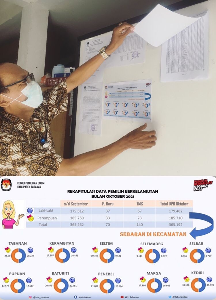 KPU Tabanan, Dangin Carik – Komisi Pemilihan Umum (KPU) Kabupaten Tabanan mengumumkan Hasil Pemutakhiran Data Pemilih Berkelanjutan (PDPB) bulan Oktober 2021. Rekapitulasi Daftar Pemilih Berkelanjutan (DPB) dan By Name DPB yang mengalami perubahan di bulan Oktober 2021 tersebut ditempel pada papan pengumuman KPU Tabanan pada Jumat, (29/10/2021).