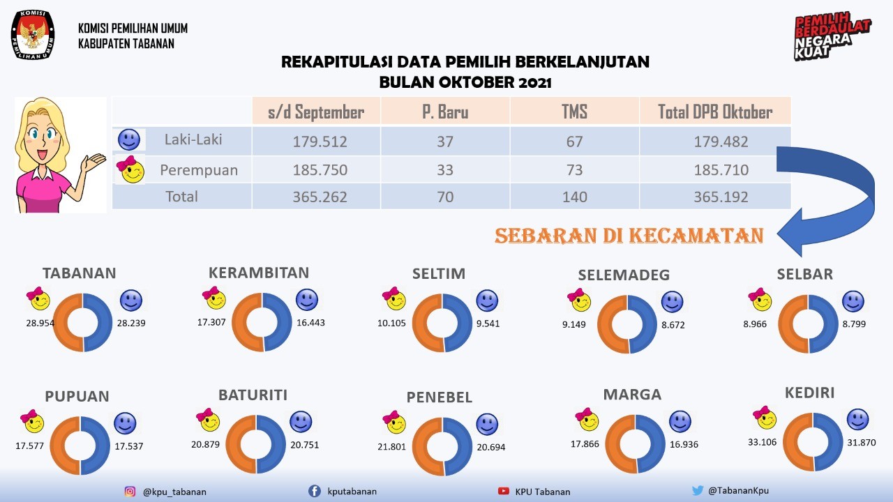Berikut disampaikan kutipan hasil PDPB bulan Oktober 2021 sebagai berikut : Jumlah Pemutakhiran Data Pemilih Berkelanjutan bulan September hahun 2021 sebanyak 365.262 Pemilih, Jumlah Pemilh Baru sebanyak 70 Pemilih, Jumlah Pemilih Tidak Memenuhi Syarat ( TMS ) sebanyak 140 Pemilih dan Jumlah Pemilih Berkelanjutan bulan Oktober tahun 2021 menjadi sebanyak 365.192 Pemilih.