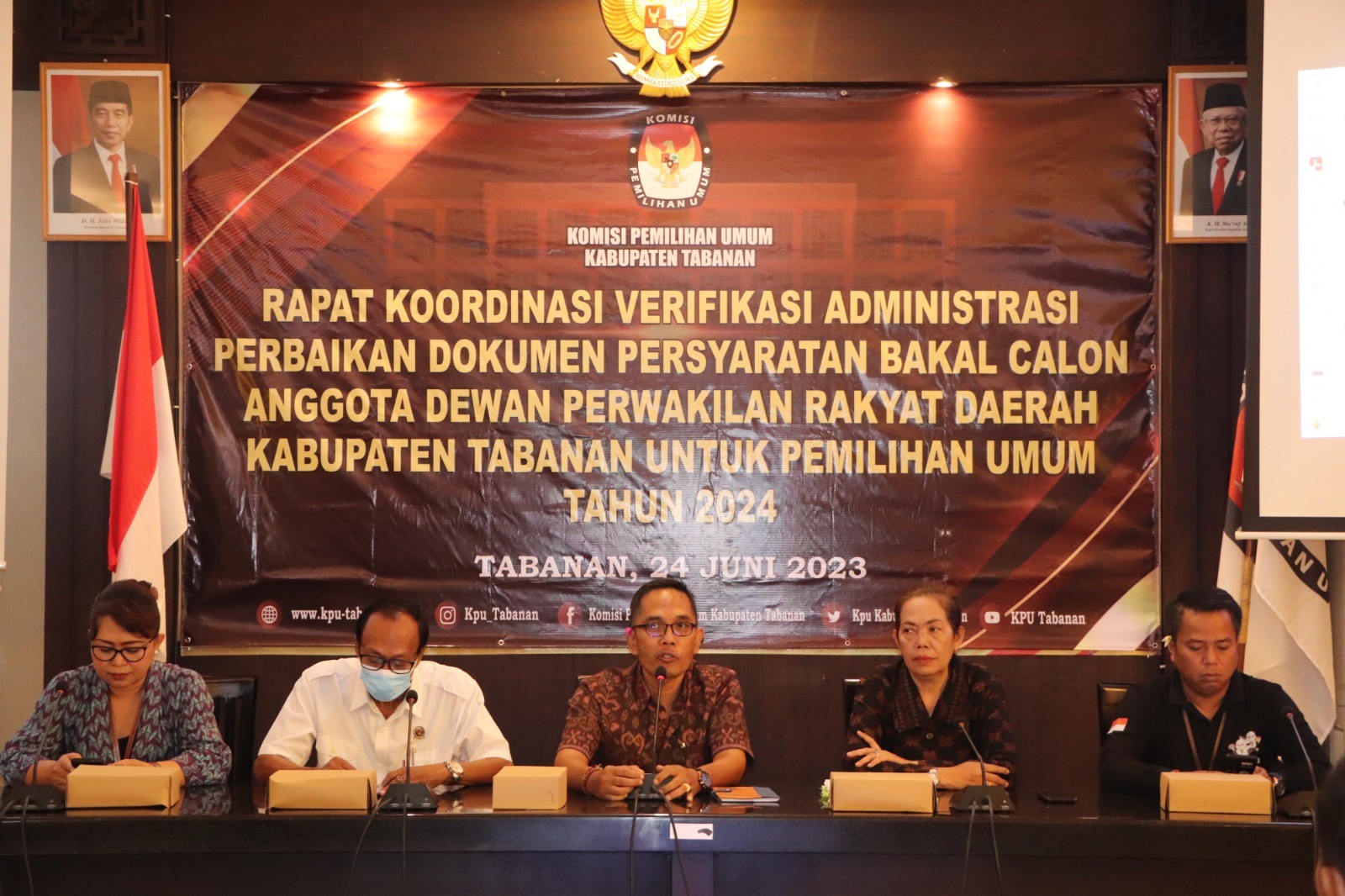 KPU Tabanan, Dangin Carik – Dalam rangka pelaksanaan Tahapan Pemilu Serentak 2024 dengan berpedoman pada Peraturan Komisi Pemilihan Umum (KPU) Nomor 10 Tahun 2023 Tentang Pencalonan Anggota Dewan Perwakilan Rakyat, Dewan Perwakilan Rakyat Daerah Provinsi, dan Dewan Perwakilan Rakyat Daerah Kabupaten/Kota, KPU Kabupaten Tabanan mengadakan Rapat Koordinasi Verifikasi Administrasi (Vermin) Perbaikan Dokumen Persyaratan Bakal Calon Anggota DPRD Kabupaten Tabanan untuk Pemilu Tahun 2024, pukul 10.00 Wita, bertempat di ruang rapat Kantor KPU Tabanan, Sabtu (24/06/2023).