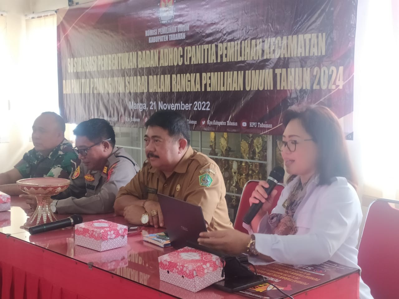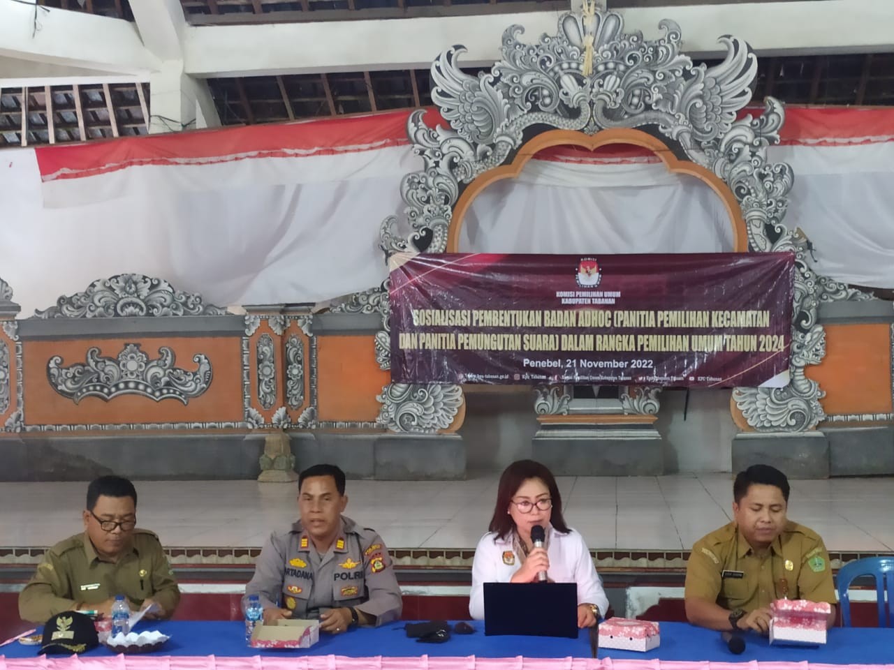 KPU Tabanan, Dangin Carik – Dalam rangka Tahapan Pemilu Serentak 2024, Anggota KPU Kabupaten Tabanan Ketua Divisi Sosialisasi, Pendidikan Pemilih, Parmas dan SDM, Ni Putu Suaryani didampingi Pegawai Sekretariat KPU Tabanan, melaksanakan sosialisasi pembentukan Badan Ad Hoc (Panitia Pemilihan kecamatan/PPK dan Panitia Pemungutan Suara/PPS) pada 5 (lima) Keacamatan.