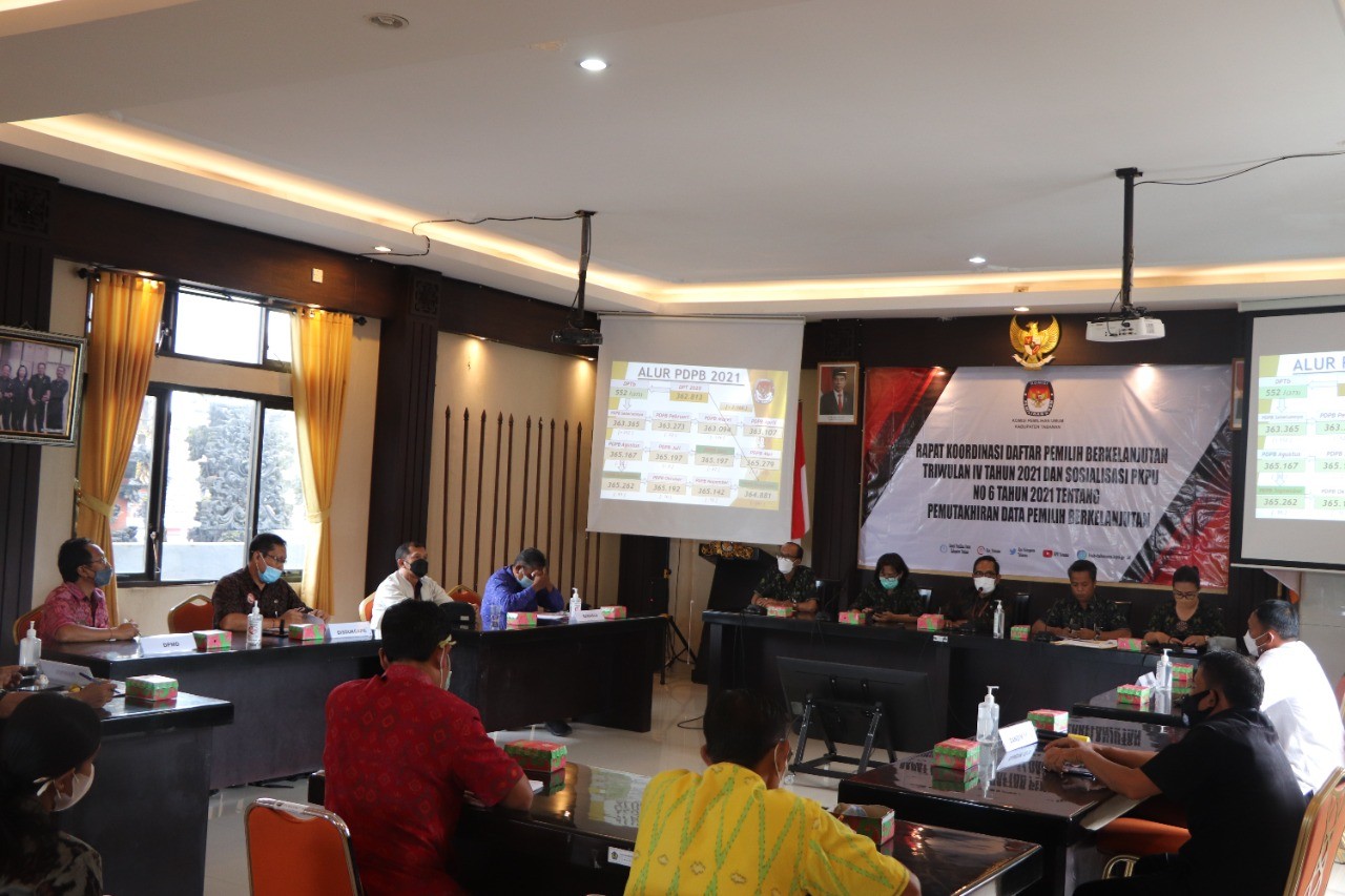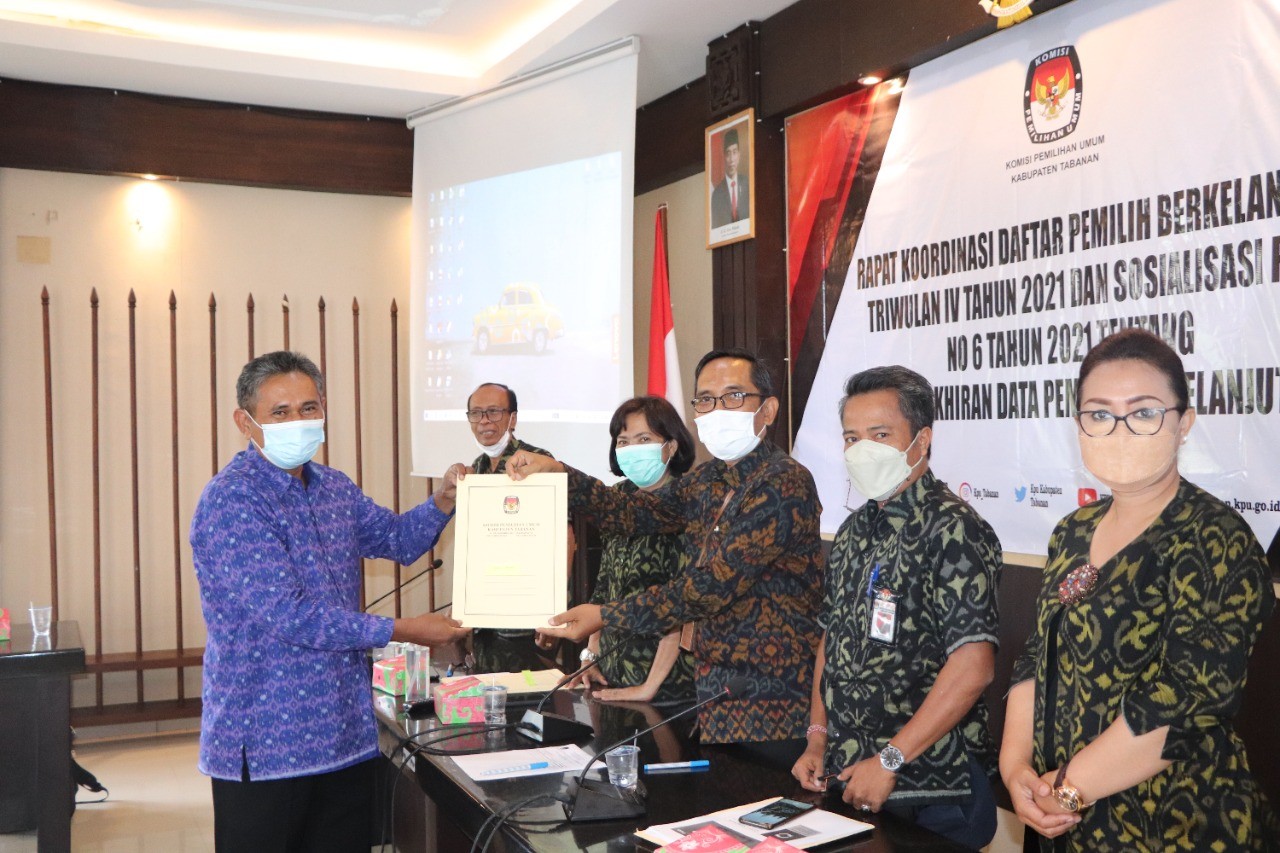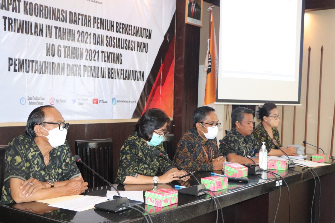 Dalam rangka pemutakhiran data Pemilih berkelanjutan tahun 2021 maka Komisi Pemilihan Umum (KPU) Kabupaten Tabanan menyelenggarakan Rapat koordinasi (Rakor) daftar Pemilih berkelanjutan triwulan IV tahun 2021 dan sosialisasi Peraturan Komisi Pemilihan Umum (PKPU) Nomor 6 tahun 2021 tentang pemutakhiran data Pemilih berkelanjutan sesuai surat undangan KPU Tabanan Nomor 1149/PP.07/5102/2021 tanggal 9 Desember 2021.