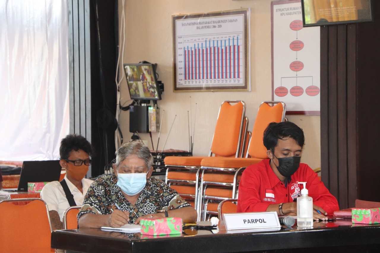 Yang hadir dalam kegiatan yakni Ketua KPU Tabanan, I Gede Putu Weda Subawa serta seluruh Anggota KPU Tabanan dan Sekretaris KPU Tabanan. Hadir pula para undangan seperti Kodim 1619 Tabanan, Polres Tabanan, Dinas Kependudukan dan Pencatatan Sipil Kabupaten Tabanan, Dinas Pemberdayaan Masyarakat Desa Kabupaten Tabanan, Anggota Bawaslu Tabanan, I Ketut Narta serta Pimpinan atau Pengurus Partai Politik (Parpol) yang ada di Kabupaten Tabanan. Selain itu hadir Anggota KPU Provinsi Bali, I Gede John Darmawan, pukul 09.30 Wita, bertempat di ruang rapat Kantor KPU Tabanan, Selasa (14/12/2021).