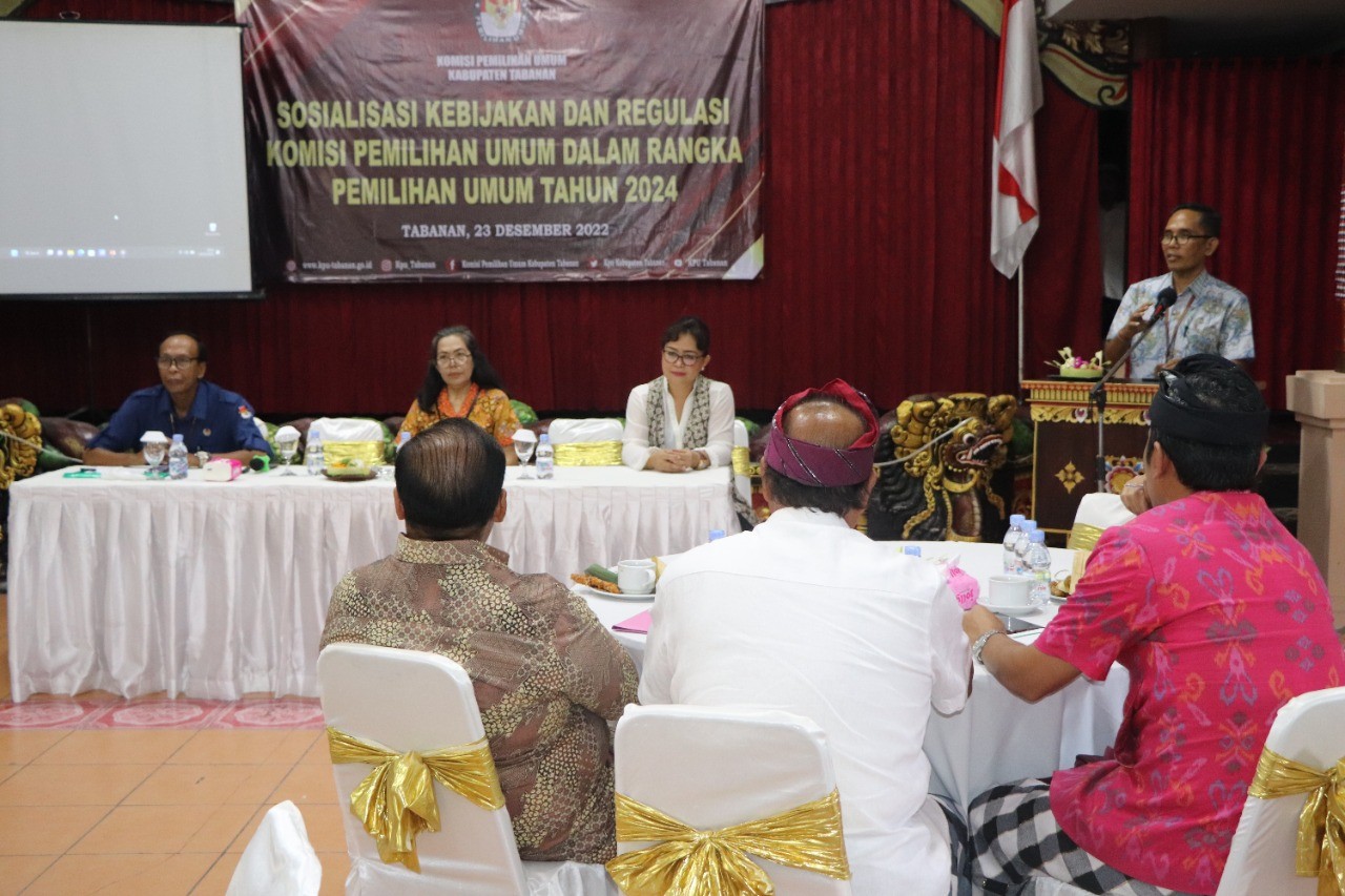 KPU Tabanan, Dangin Carik – Dalam rangka pelaksanaan Tahapan Pemilu Serentak 2024, KPU Kabupaten Tabanan menyelenggarakan sosialisasi kebijakan dan regulasi KPU dalam Pemilu tahun 2024, bertempat di Restoran Dewi Sinta, Jalan Tanah Lot, Beraban, Kediri, Tabanan sekitar pukul 10.00 Wita, Jumat (23/12/2022).