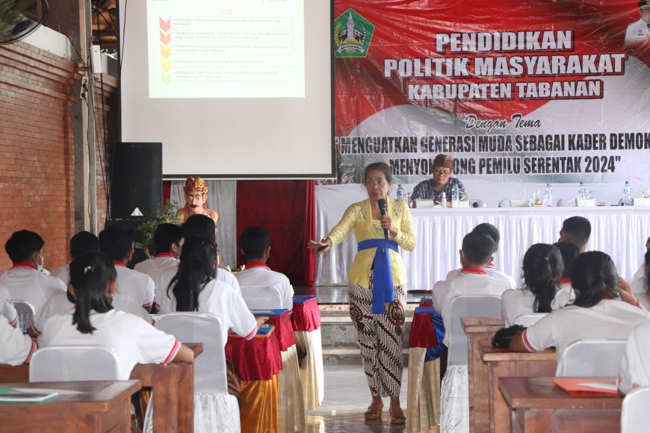 Tujuan acara ini sesuai surat undangan Badan Kesbangpol Tabanan adalah dalam rangka meningkatkan persentase partisipasi Masyarakat menggunakan hak pilih dalam Pemilu dan meningkatkan pemahaman Masyarakat tentang politik. “Sebagai Peserta dari SMA Negeri 1 Kediri,” ucap Pegawai Sekretariat KPU Tabanan yang ikut mendampingi Komisioner KPU Tabanan, senada dengan yang disampaikan Luh Made Sunadi.