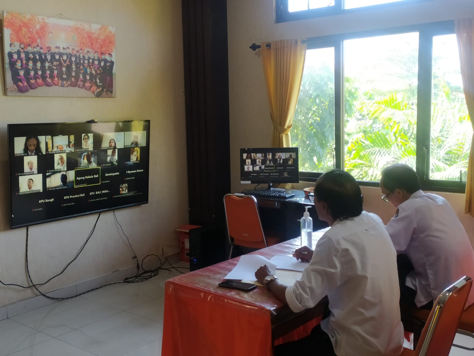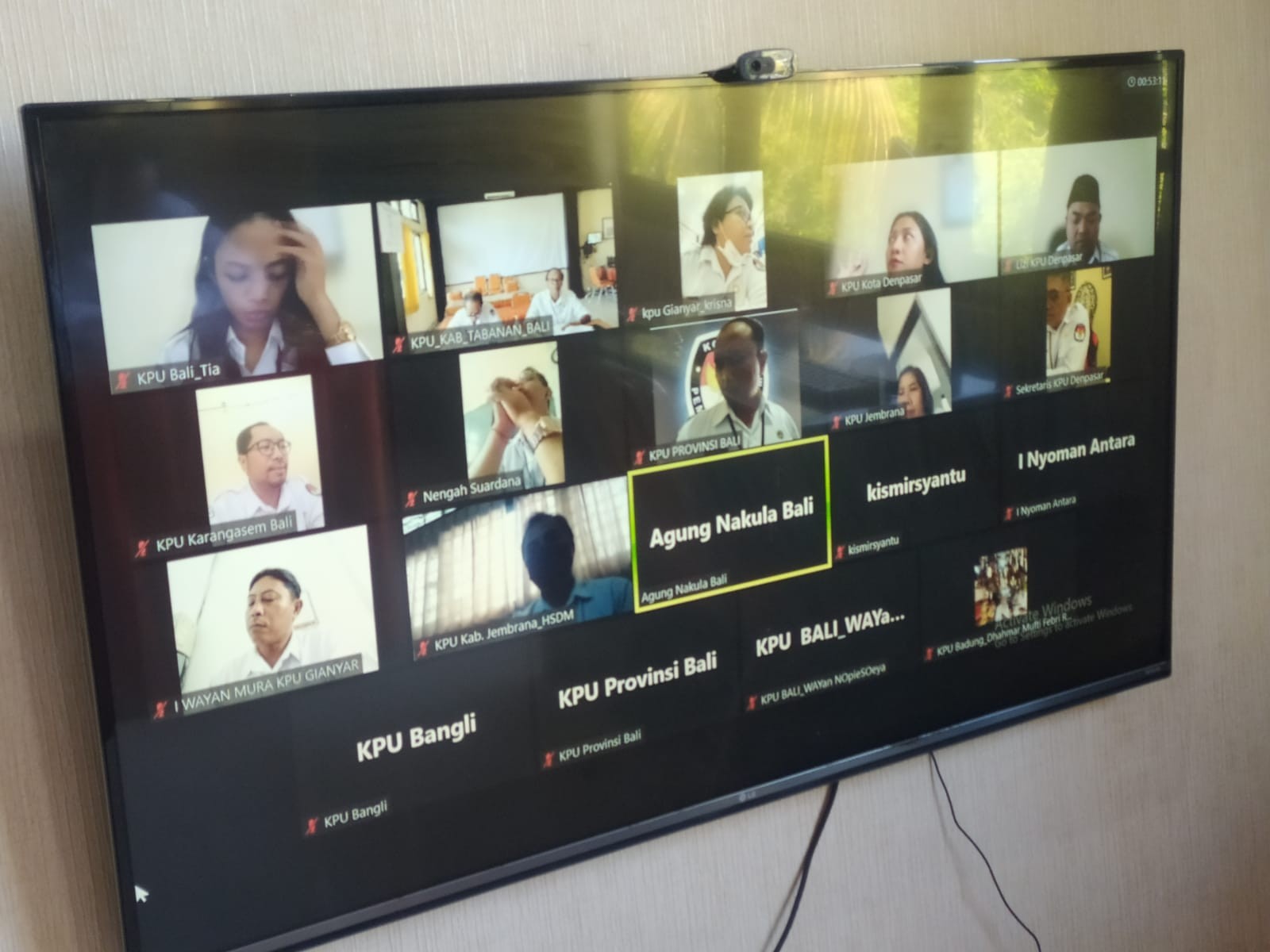 Terlihat juga hadir Kepala Sub Bagian Hukum dan SDM, I Made Suartika. Menurut informasi bahwa pertemuan online yang diadakan KPU Bali ini untuk membahas persiapan Bimtek penanganan pelanggaran administrasi dan sengketa proses Pemilu.
