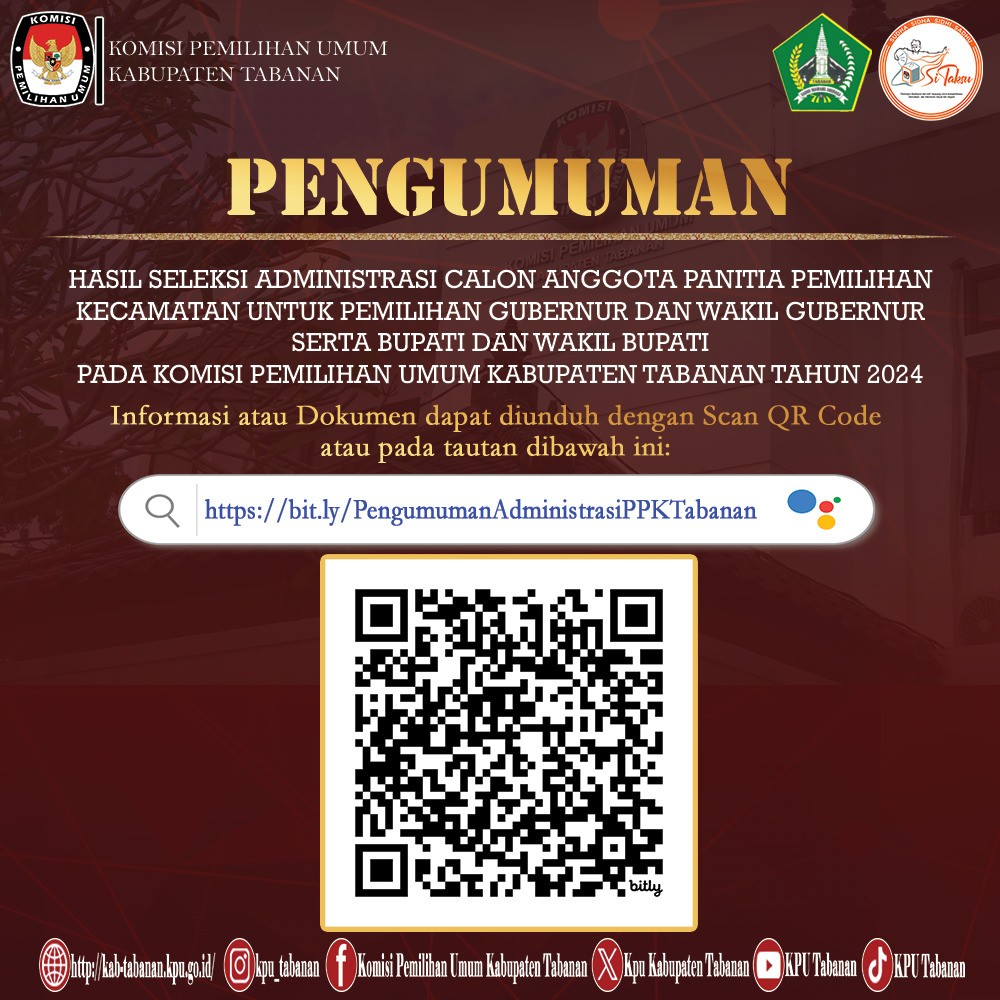 KPU Tabanan umumkan hasil Seleksi Administrasi Calon Anggota Panitia Pemilihan Kecamatan Pilkada Tahun 2024, bisa di akses melalui barcode dan tautan berikut