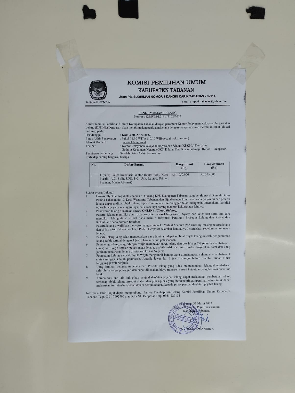 Pengumuman ini ditujukan kepada masyarakat umum bahwa Komisi Pemilihan Umum Kabupaten Tabanan dengan perantara Kantor Pelayanan Kekayaan Negara dan Lelang ( KPKNL ) akan laksanakan Penjualan Lelang dengan cara penawaran melalui internet ( closed bidding ) . Informasi selengkapnya klik download
