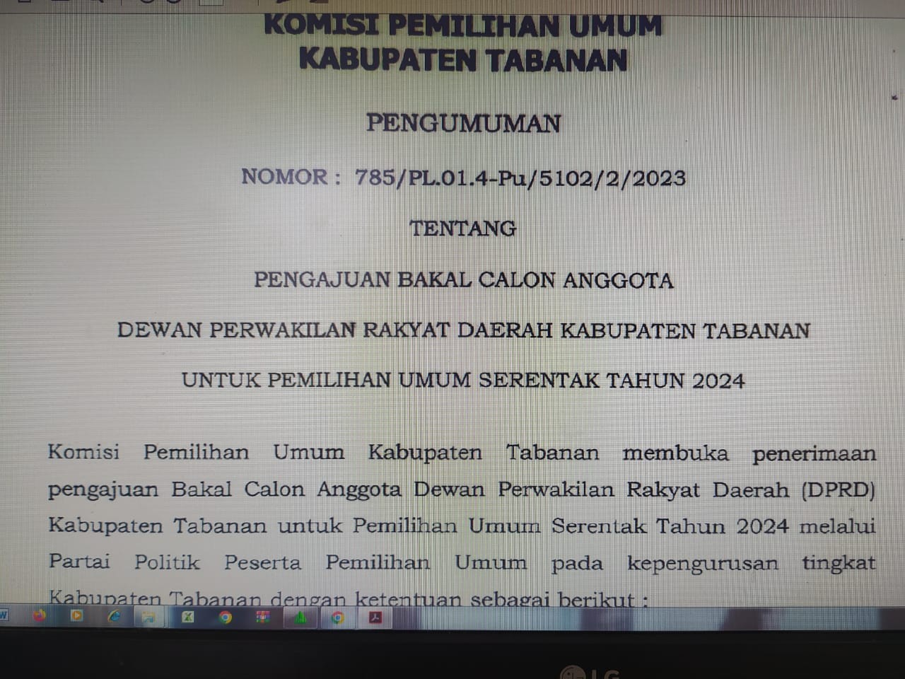 Komisi Pemilihan Umum (KPU) Kabupaten Tabanan menyampaikan Pengumuman Nomor 785/PL.01.4-PU/5102/2/2023 Tentang Pengajuan Bakal Calon Anggota Dewan Perwakilan Rakyat Daerah (DPRD) Kabupaten Tabanan Untuk Pemilihan Umum Serentak Tahun 2024, tanggal 24 April 2023.
