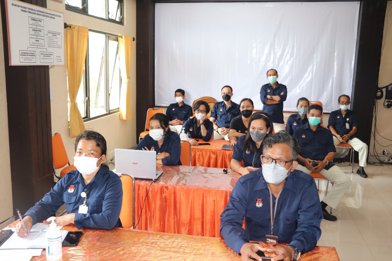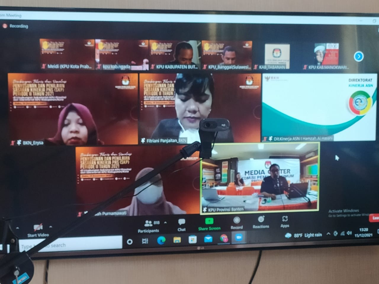 KPU Tabanan, Dangin Carik – Jajaran Sekretariat Komisi Pemilihan Umum (KPU) Kabupaten Tabanan mulai dari Sekretaris, Kasubbag hingga seluruh Staf PNS Sekretariat KPU Tabanan hari ini, Rabu (15/12/2021), pukul 10.00 Wita, bertempat di ruang rapat Kantor KPU Tabanan, mengikuti Zoom Meeting Bimbingan Teknis (Bimtek) dan simulasi penyusunan dan penilaian sasaran kinerja PNS periode II tahun 2001.