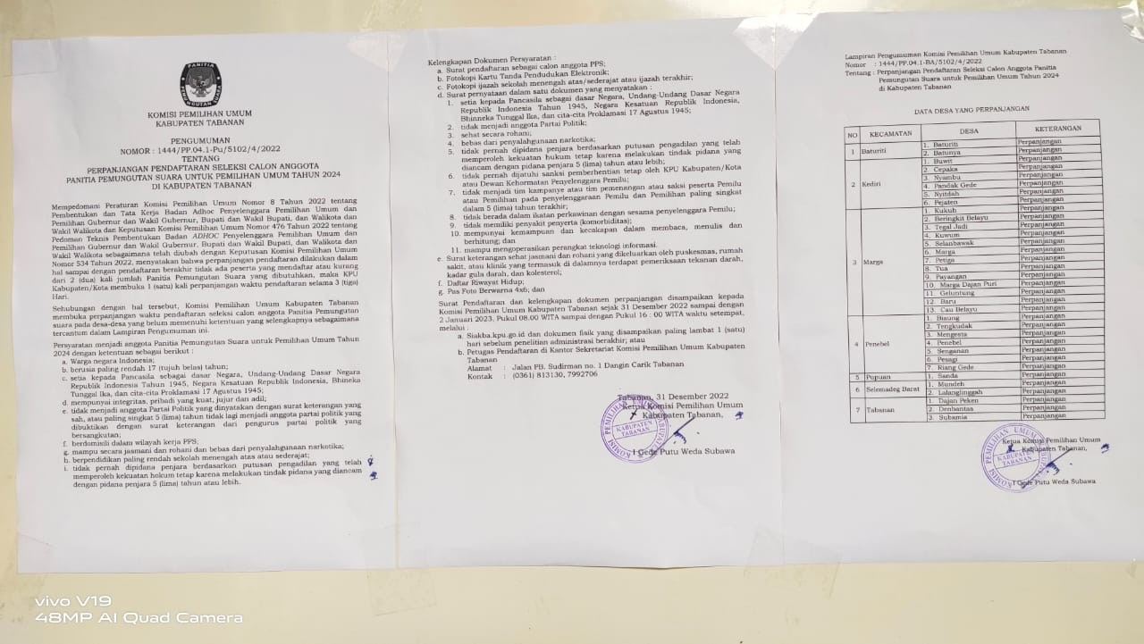 Komisi Pemilihan Umum (KPU) Kabupaten Tabanan menyampaikan Pengumuman Nomor 1444/PP.04.1-Pu/5102/4/2022 tentang Perpanjangan Pendaftaran Seleksi Calon Anggota Panitia Pemungutan Suara (PPS) untuk Pemilihan Umum tahun 2024 di Kabupaten Tabanan. Masa perpanjangan dilaksanakan mulai tanggal 31 Desember 2022 - 2 Januari 2023, pukul 08.00 - 16.00 Wita.