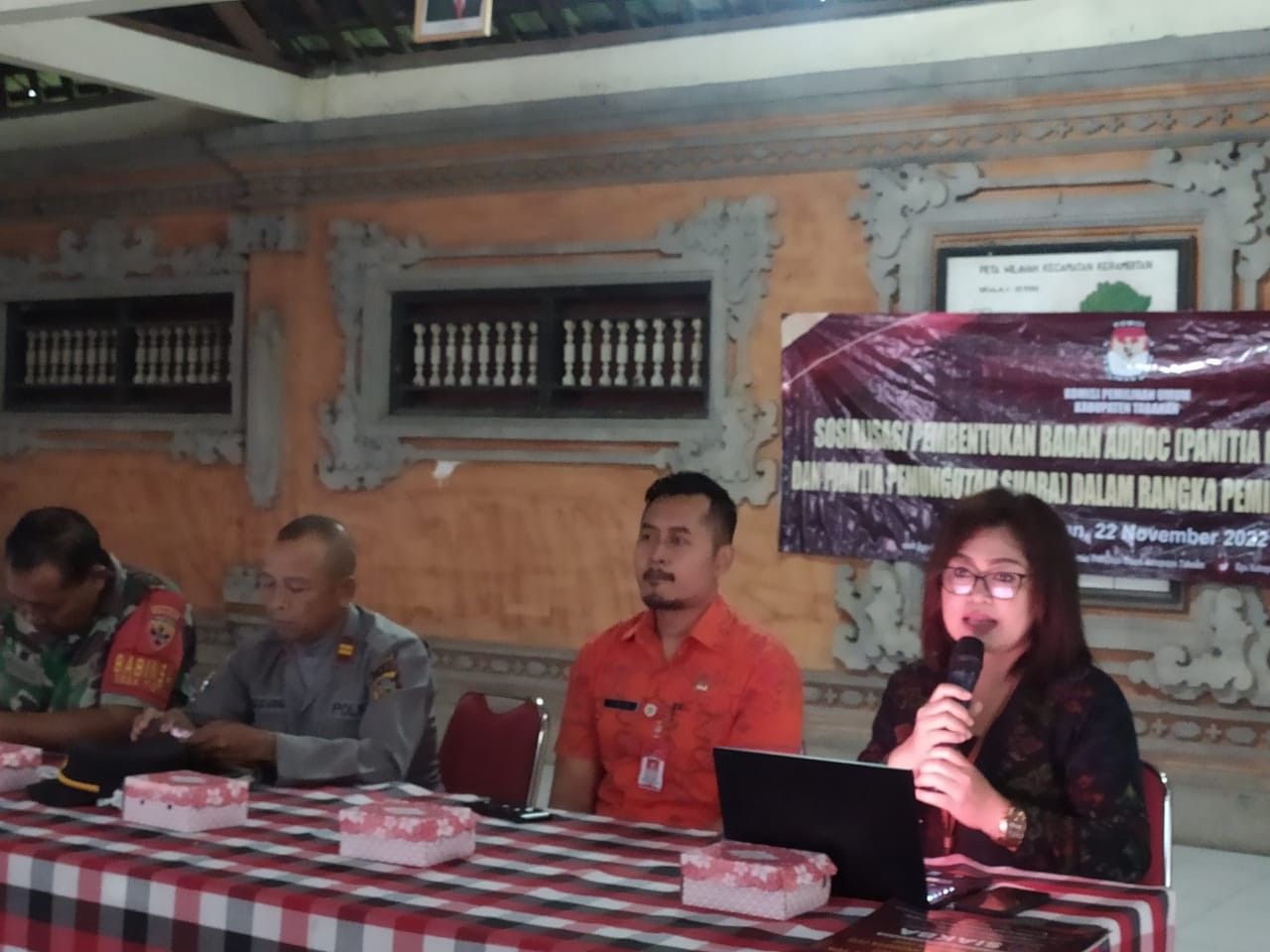KPU Tabanan, Dangin Carik – Dalam rangka Tahapan Pemilu Serentak 2024, Anggota KPU Kabupaten Tabanan Ketua Divisi Sosialisasi, Pendidikan Pemilih, Parmas dan SDM, Ni Putu Suaryani didampingi Pegawai Sekretariat KPU Tabanan, melaksanakan sosialisasi pembentukan Badan Ad Hoc (Panitia Pemilihan Kecamatan/PPK dan Panitia Pemungutan Suara/PPS) pada 5 (lima) Kecamatan.